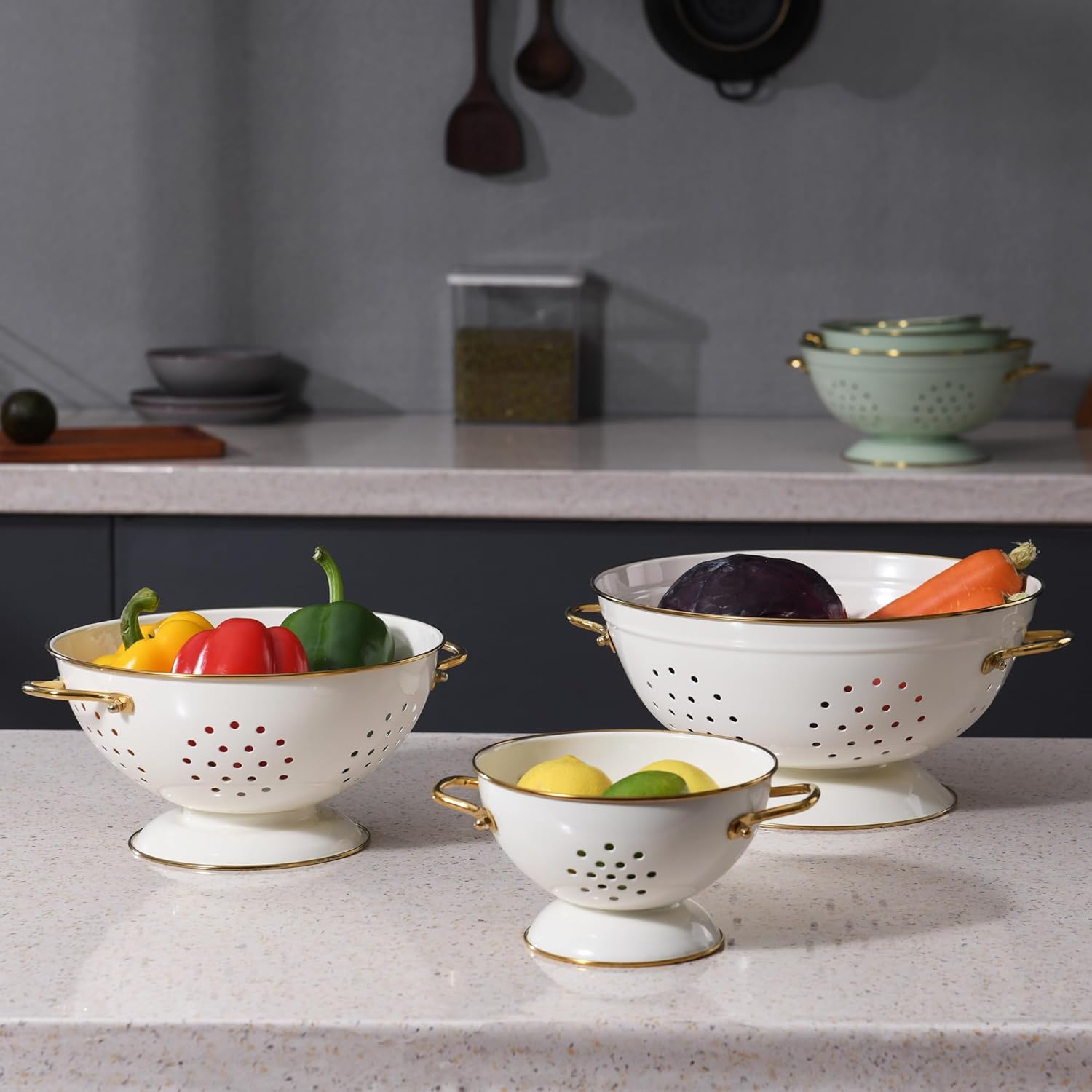 Metal Colander Set of 3, Strainer Basket with Handles perfect for Spaghetti, Pasta, Berry, Vegetable, Fruit, Solid Base Powder Coated Kitchen Essential Strainer Set, 1 & 3.5 & 5 Qt (Cream)