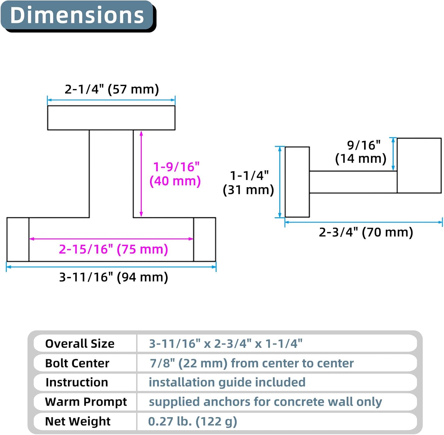 - KEEP CLEAN AND TIDY: 2 hooks space 2-15/16"(75mm), allows spreading and drying out damp towels quickly, distance between 2 mounting screw holes is 7/8"(22mm) from center to center, length of the supplied screw is 1-3/16” (30 mm), mounting hardware included for solid concrete wall