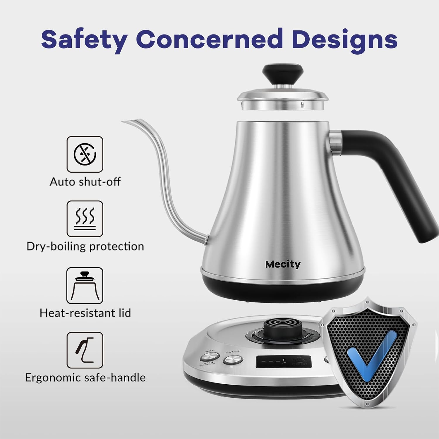 - Multiple Protection For Your Safety: or safety reasons, our kettle is equipped with an anti-dry function, automatic shut-off mechanism, and an insulated handle. The kettle will automatically shut off when the pot reaches desired temperature or when there is no water inside. The handle and lid are heat resistant and sturdy