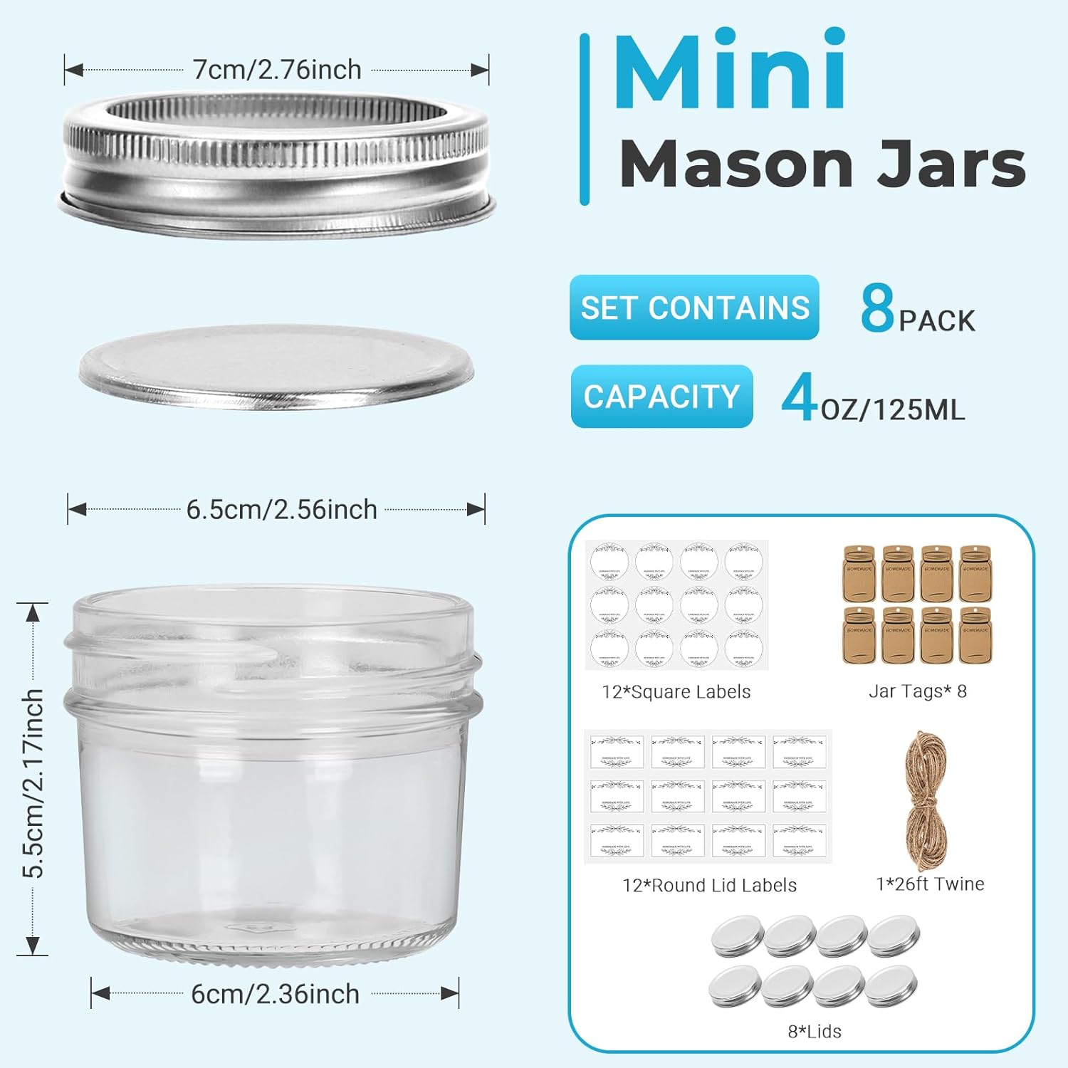 Eathtek Small Mason Jars 8 Pack, 4oz/120ml Mini Canning Jars with Regular Lids for Jelly Herbs Spice Honey Storage, Small Glass Jars Candle jars, Extra Lids Tags Label Included