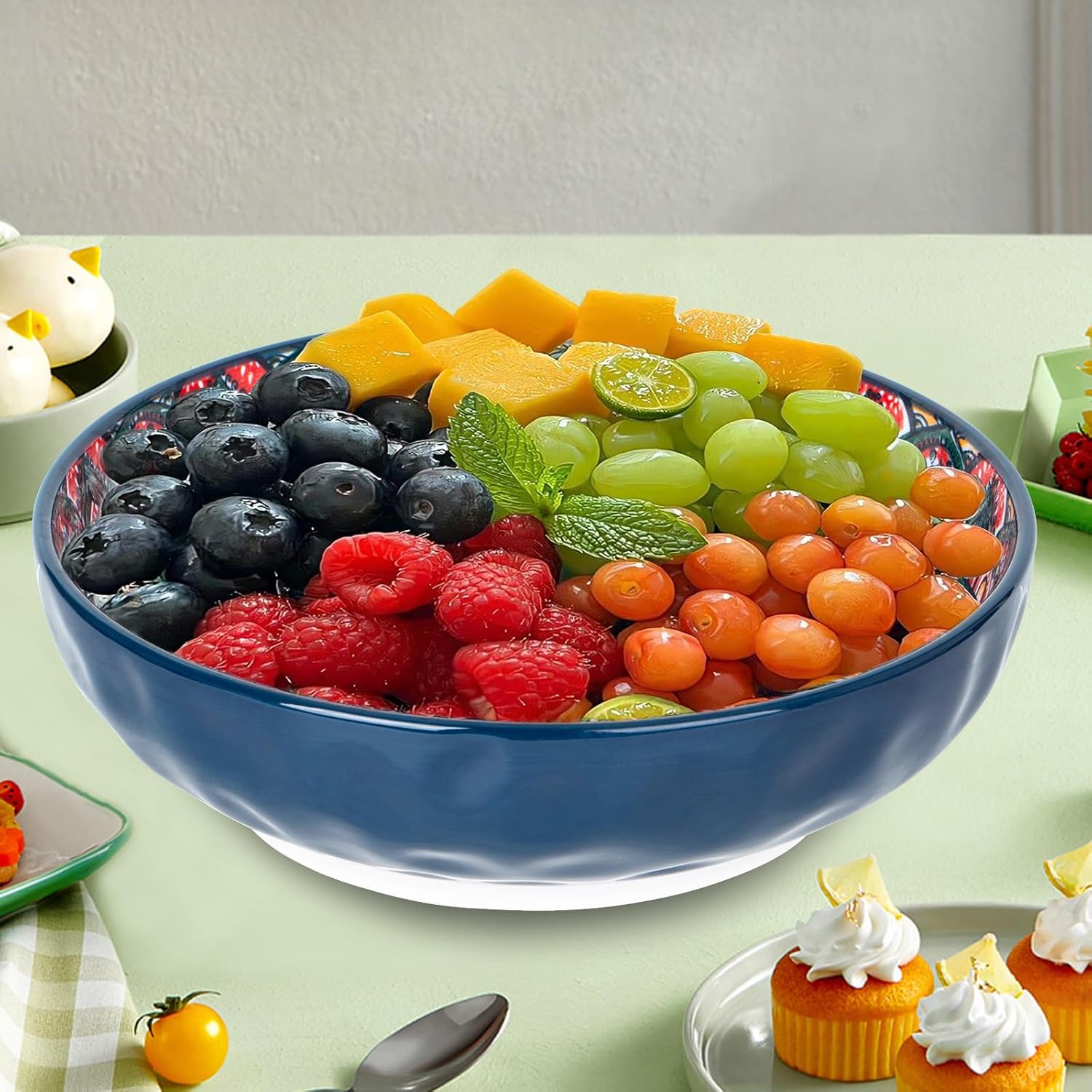75 Oz Serving Bowls,Bohemian Style Large Porcelain Dishes for Entertaining Parties,Big Bowls for Eating Soup, Salad, Pasta, Fruit, Chips, 10.3 Inch Diameter (blue)