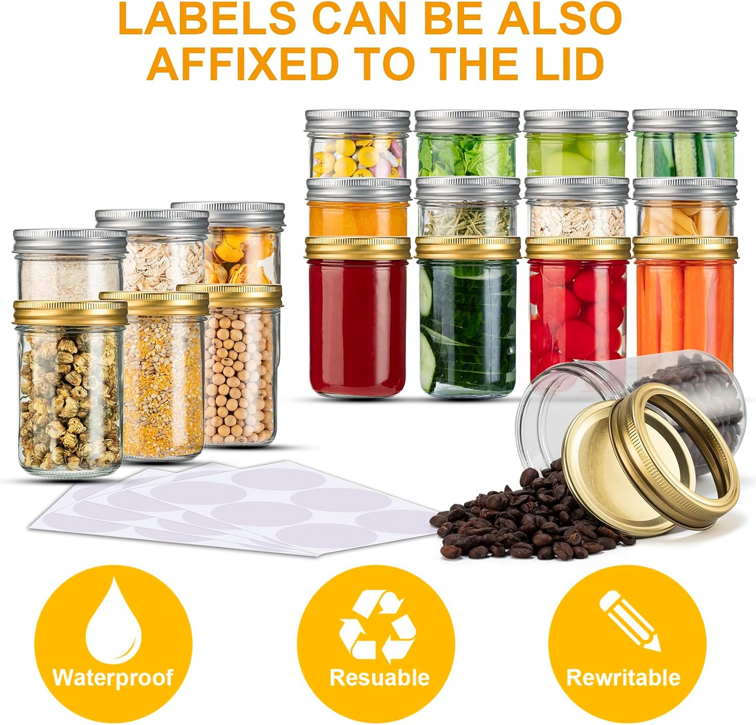 - ✅ MASON JARS SET INCLUDE - 24 pack mason jars 8 oz with 12 Silver Lids & 12 Golden Lids and Free 24 Labels. Silver and Golden Lids let your jars have different style.