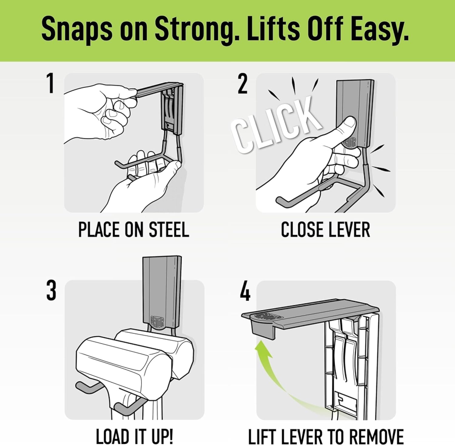 - Gator Magnetics Patented Technology: Exponentially stronger than traditional magnets, our optimized hook holds its load securely at a right angle to the floor. Our patented easy-release lever lets you remove and reposition in seconds for adaptive storage
