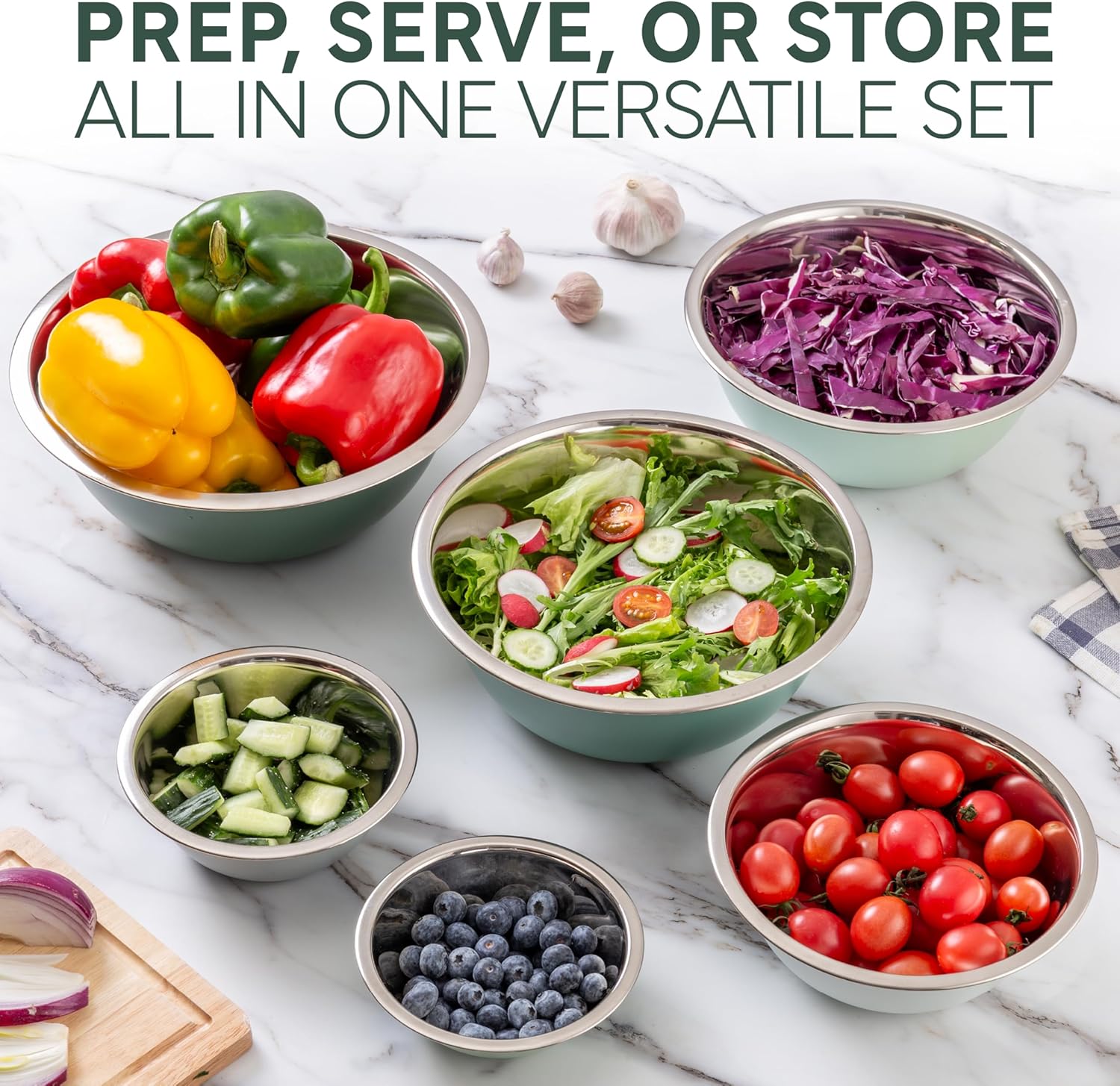 - 6 Piece Stainless Steel Nesting Bowls Set includes 6 Prep Bowl and Mixing Bowls - a practical set of easy to clean kitchen bowls that can be used for food prep, serving and storing.