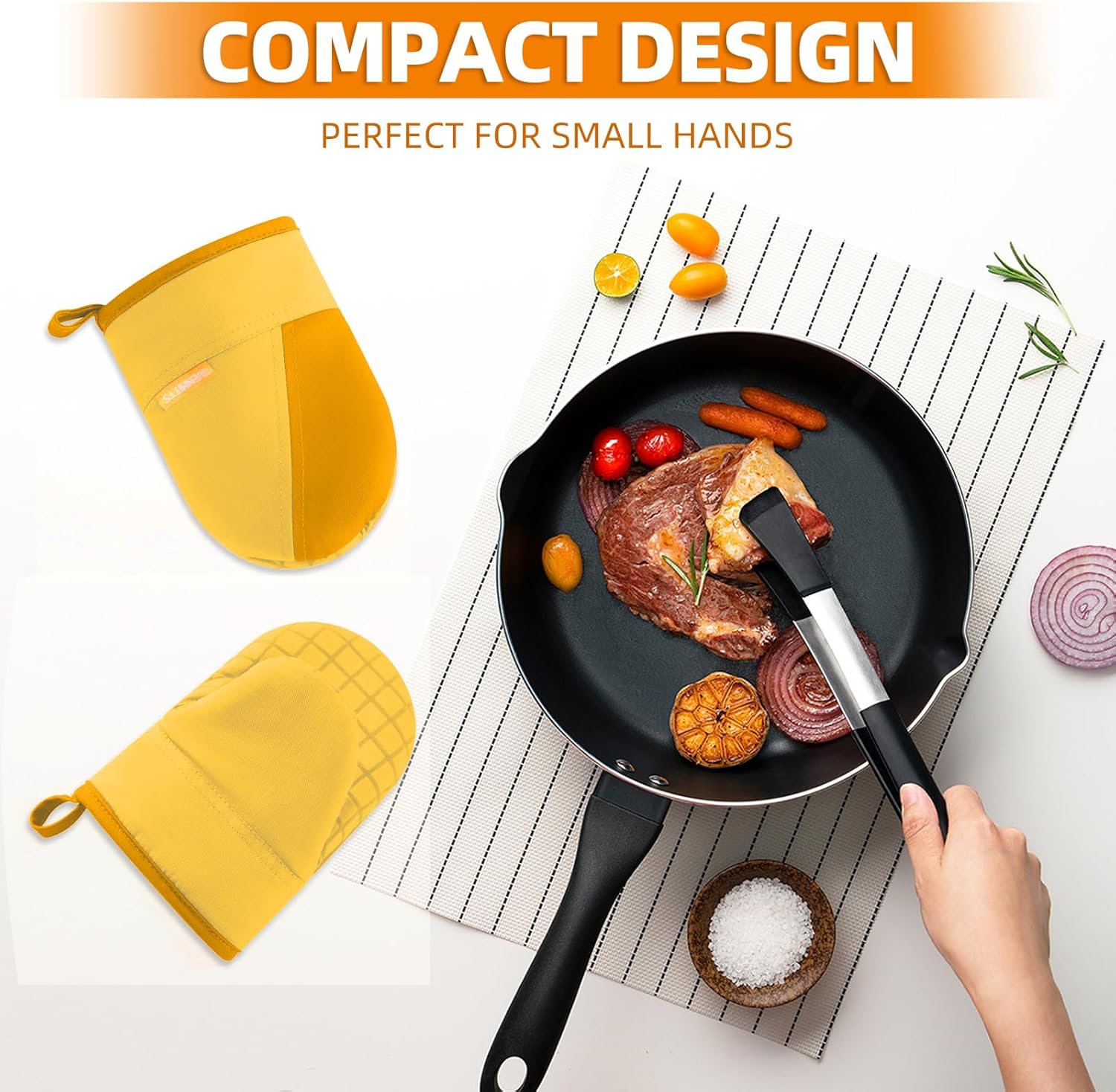 - SILICONE ANTI-SLIP SURFACE: The surface of mini oven mitts print full silicone pattern on finger and thumb to increase grip when you hold hot pans, pots, bowels. Meanwhile, the surface silicone will not melt within the 500β/260β range.