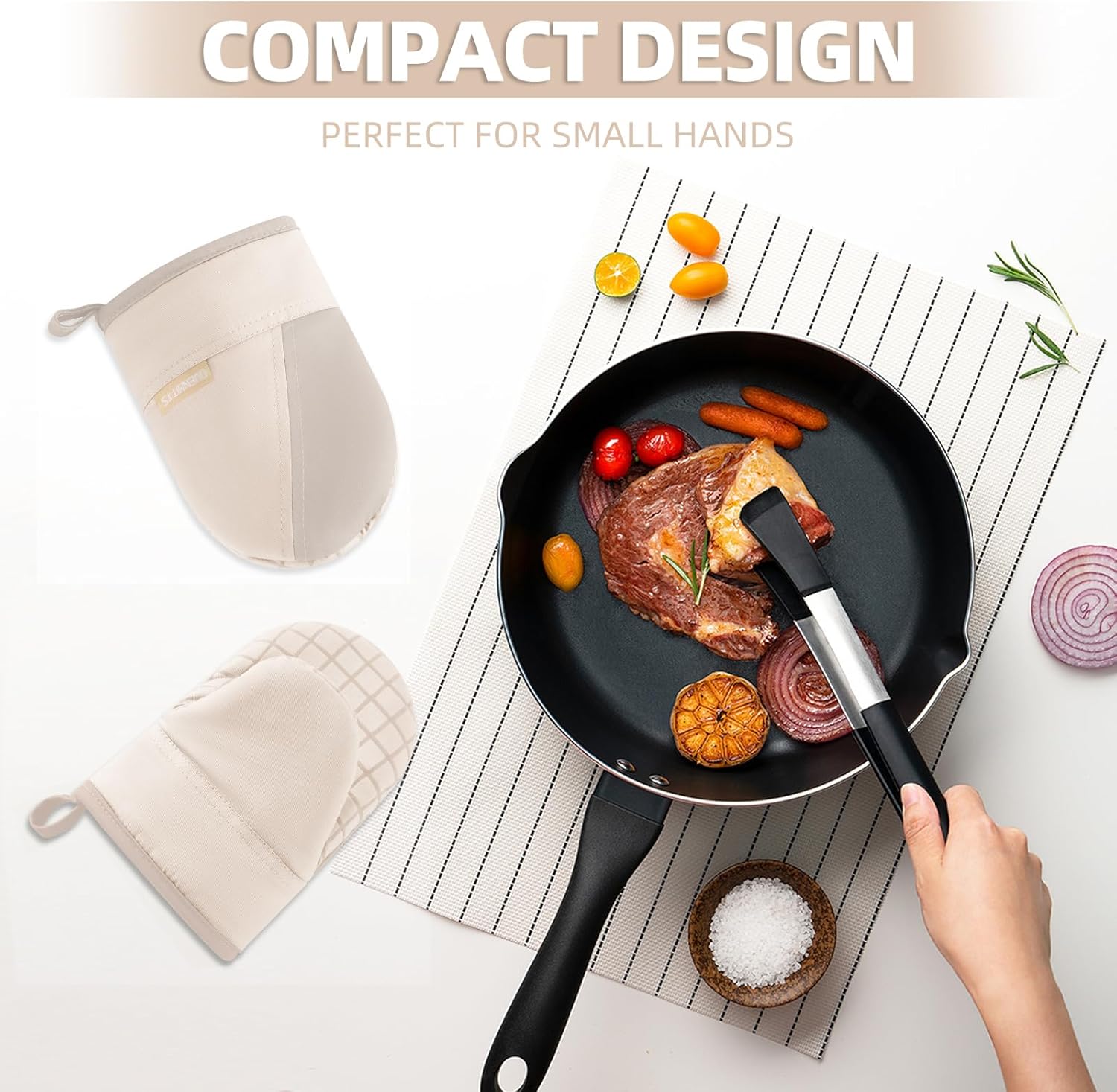 - SILICONE ANTI-SLIP SURFACE: The surface of mini oven mitts print full silicone pattern on finger and thumb to increase grip when you hold hot pans, pots, bowels. Meanwhile, the surface silicone will not melt within the 500β/260β range.