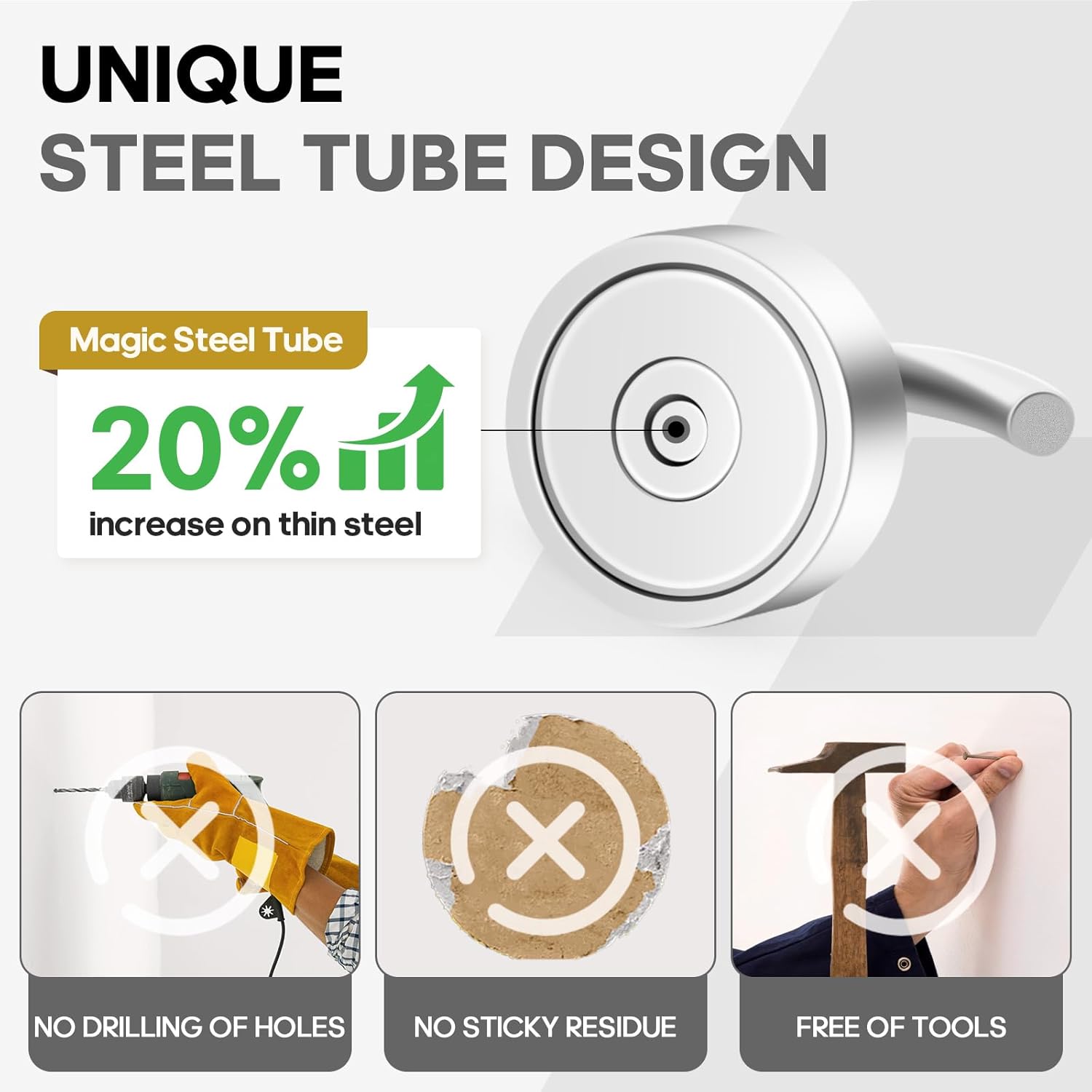 - ✔MAGIC STEEL TUBE DESIGN - Unique design of steel tube inside the base of magnetic hooks greatly increases the attractive force , especially on thin steel! It increase approximately 20% force comparing those none-tube magnets. it solves the problem of weak force on thin steel. Permanent magnetic hook with magic steel tube, strong magnetism lasts forever!