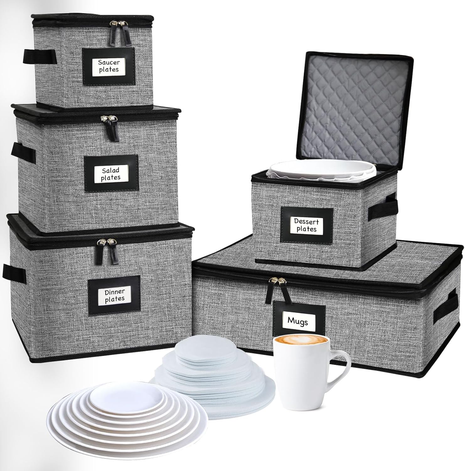 5 PACK China Storage Containers-Quilted Mug Storage and Moving Boxes for Dishes,Dish Packing Supplies for Moving,Dinnerware &Accessories,Holds a total of 48 plates (4 sizes) and 12 cups(Grey)
