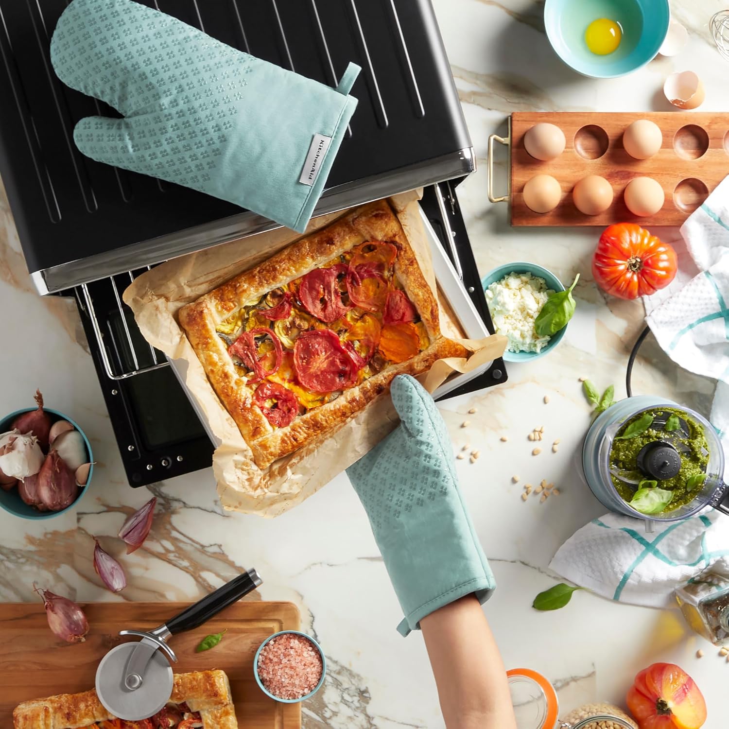 - SET OF TWO: Protect both hands while handling hot pots and pans. Set includes two (2) KitchenAid Asteroid Oven Mitts in mineral water aqua, 7" W x 12.5" L.