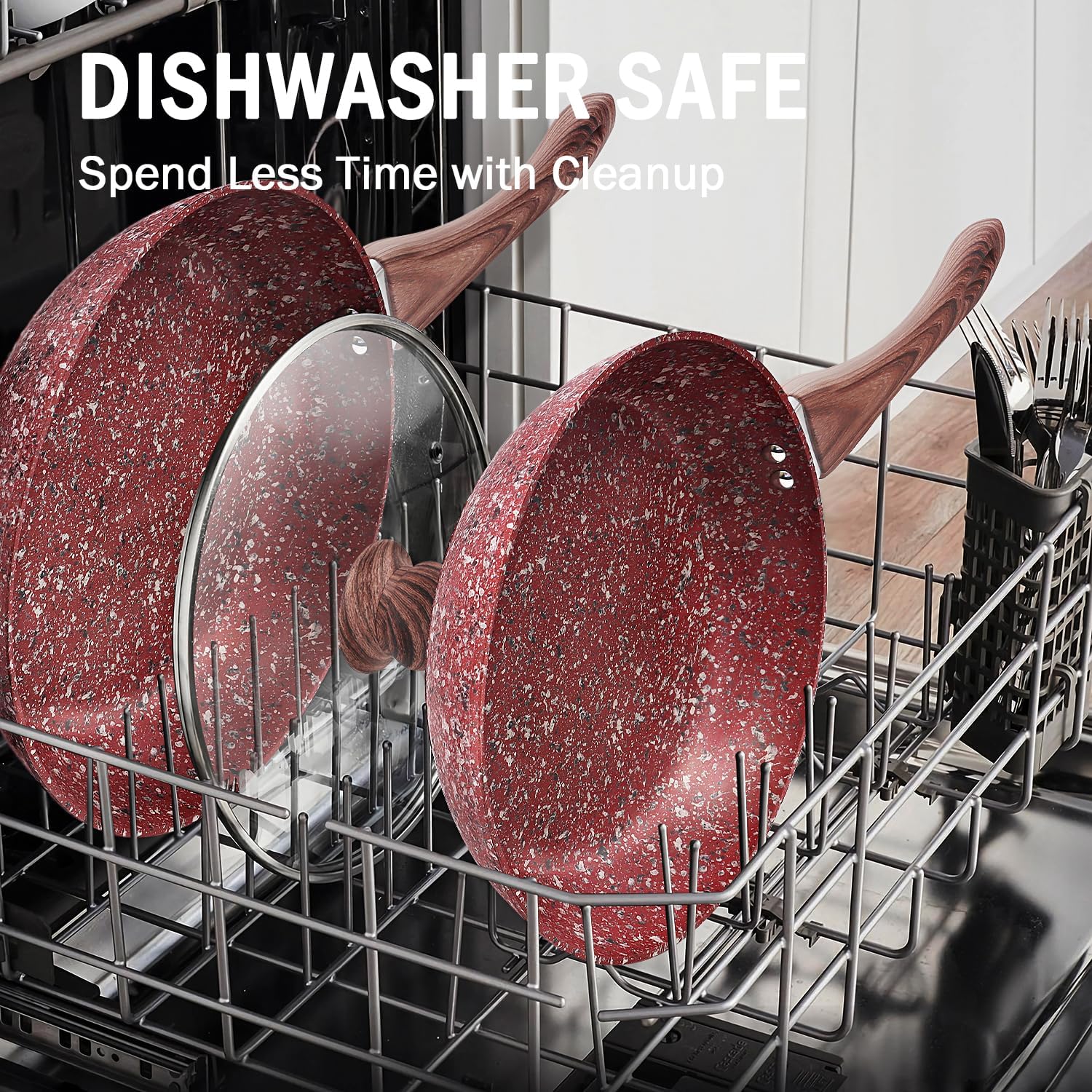 KOCH SYSTEME CS 12" Red Granite Non-Stick Frying Pan with Lid, Classic Pans with Non-toxic Nonstick Coating, Aluminum Skillet with Heat-resistant Bakelite Handle, Induction Compatible Frying Pan