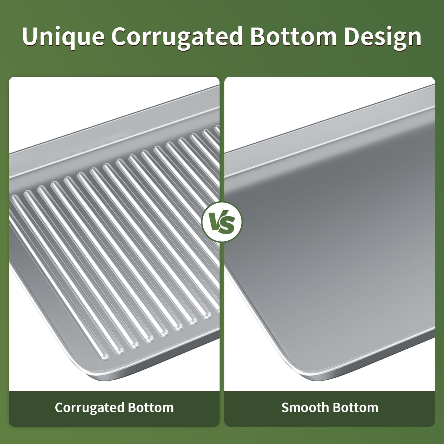 - 【Corrugated Surface】 Unique design with corrugated surface in the bottom of sheet pan, to reduce the risk of food sticking, facilitates air flow for quick release and even baking. This design also strengthen the structure to the pan for warp resistance.