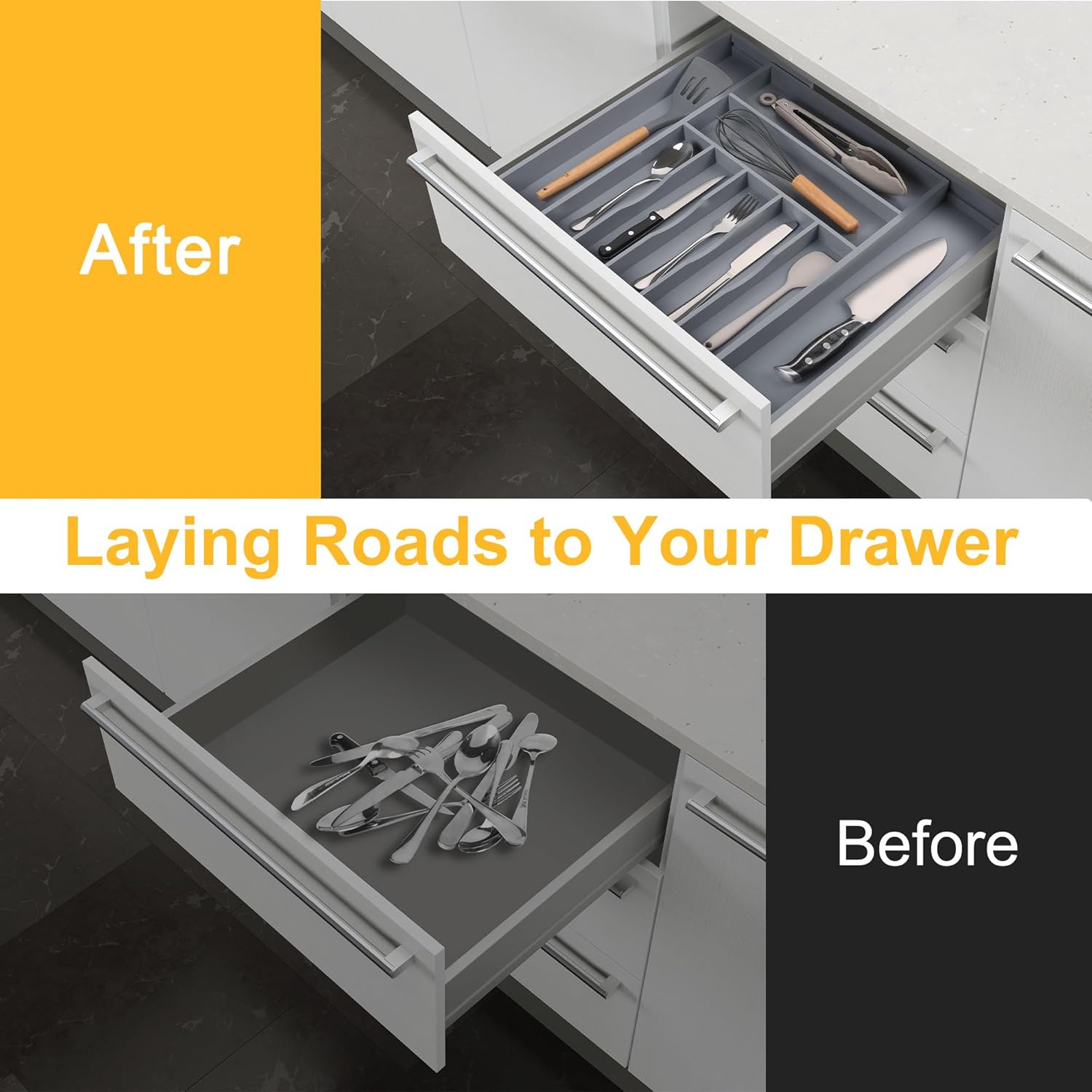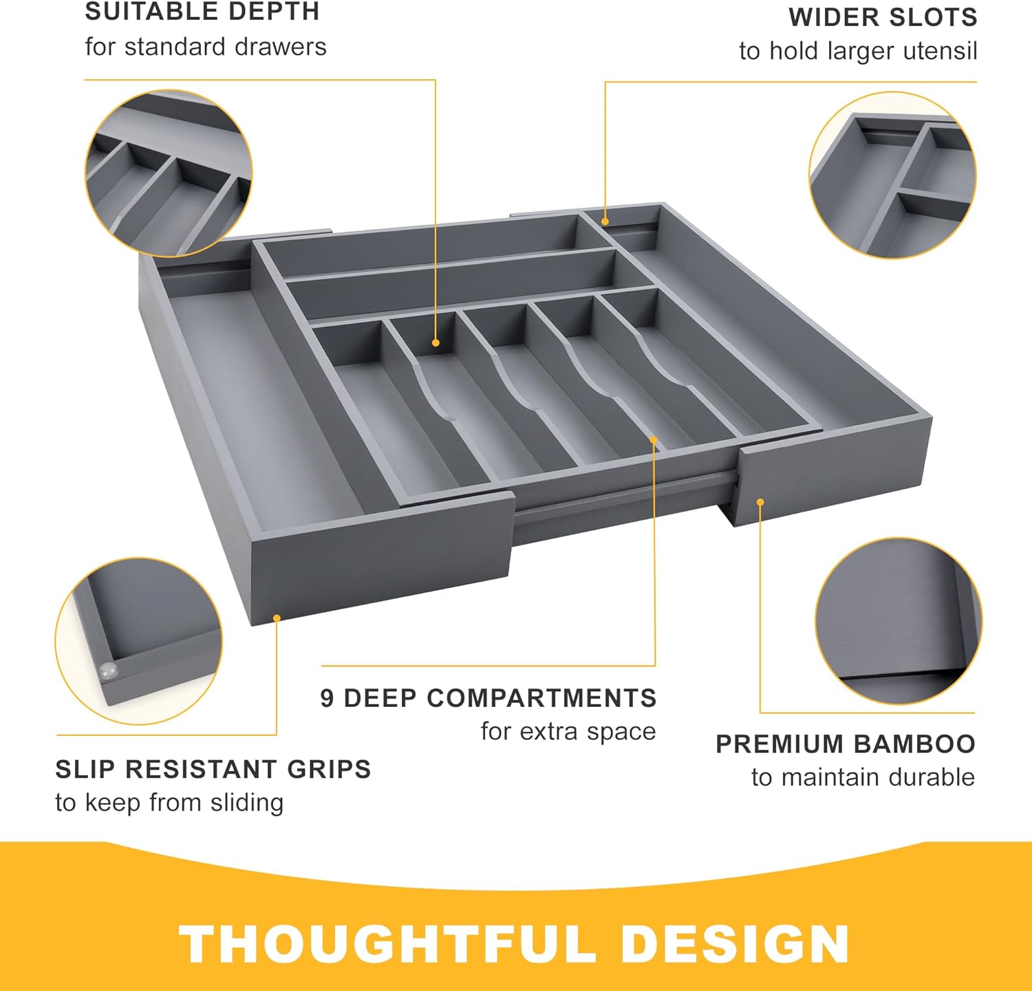 - â ăSimplify Your Cooking ExperienceăOur cutlery organizer is not only great for storing flatware, but can also be used as a kitchen drawer organizer for large utensils such as spatulas, spoons, ladles, and more. Take advantage of our beautiful bamboo organizers expandability and 9 main compartments, cooking just got a whole lot easier with your cutlery clearly visible in one place for quick & convenient use.