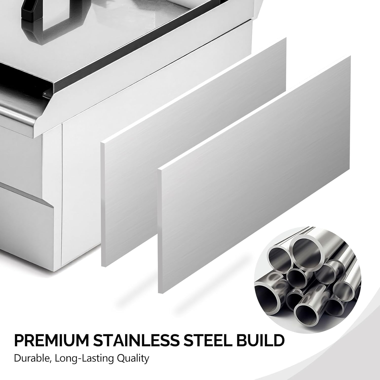 - 【24.9QT Large Capacity】The maximum capacity of each tank is about 12.5QT. Total maximum capacity 24.9QT. Recommended total oil capacity up to 15QT/14.16L (7.5QT for each tank). Single Basket Capacity: 6.55QT. What’s more, each side has a power plug, which allows to operate each side separately and fry different kinds of food at the same time. MAX power: 3400W (1700W for each plug). (NOTE: There are white protective tapes on surface. Please peel off them before use.)