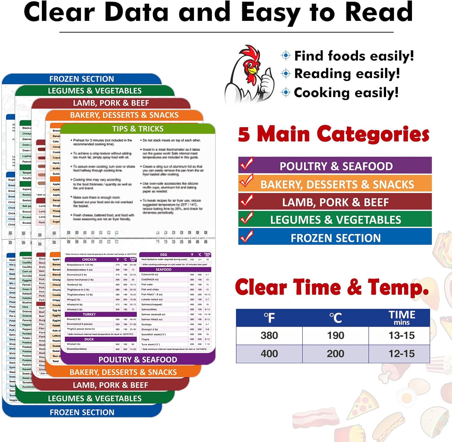 - ใ๐๐๐ฌ๐ฒ ๐ญ๐จ ๐๐๐๐ใAir fryer cooking times chart is clear classified and labeled with ergonomic font size, easy to read at a glance.