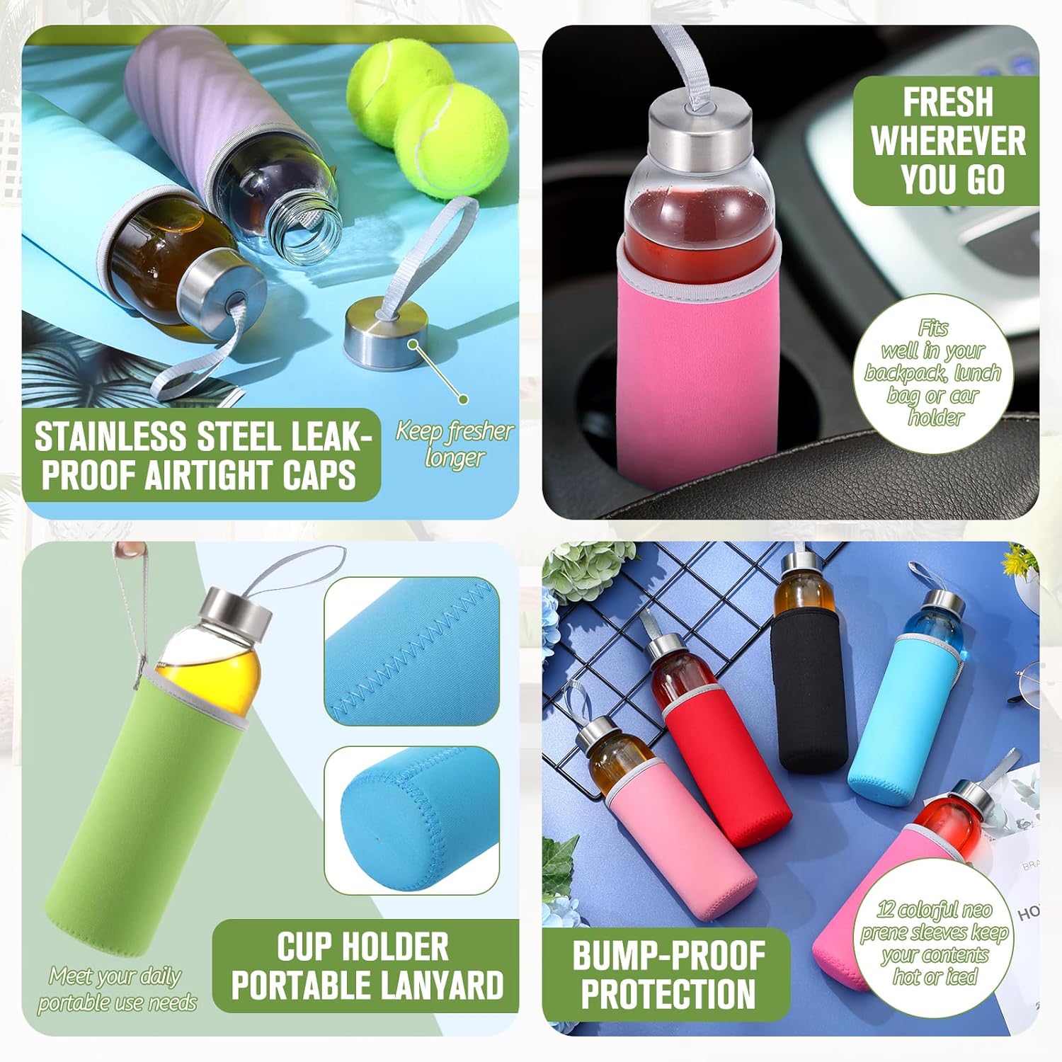 - Pack a Surprise: a chic gift for your loved ones or a reward for a team, our set of 12 glass water bottles with protection sleeve and stainless steel lids is all about spreading happiness with health; Let your gift say you care for them and their wellbeing
