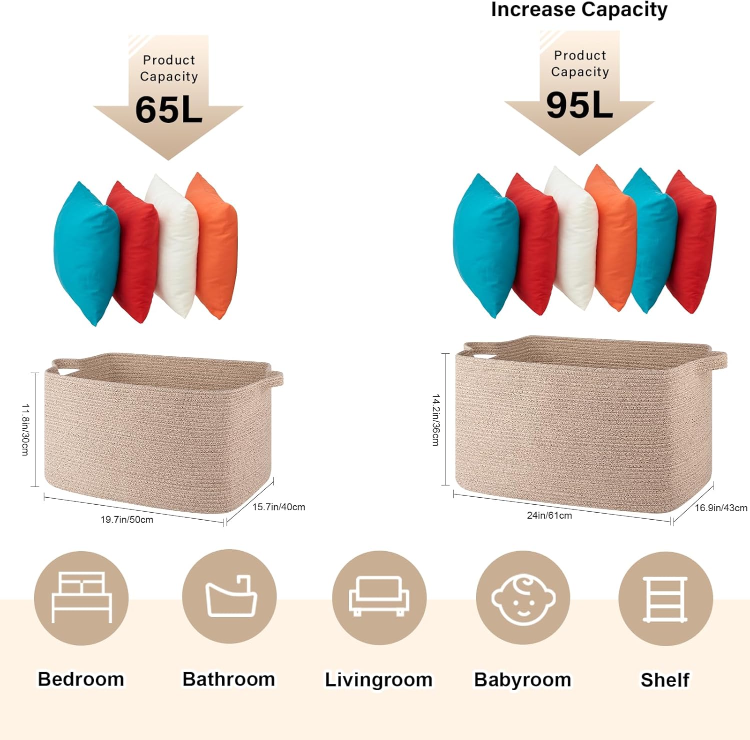 - Large Storage Basket: 65L large storage basket, perfect for throwing pillows, cushions, blankets, comforters, toys, and clothes. Keep the toy basket in the kid's room, family room, or any room in the house that could use extra storage: fits on a closet shelf, bookshelf, etc