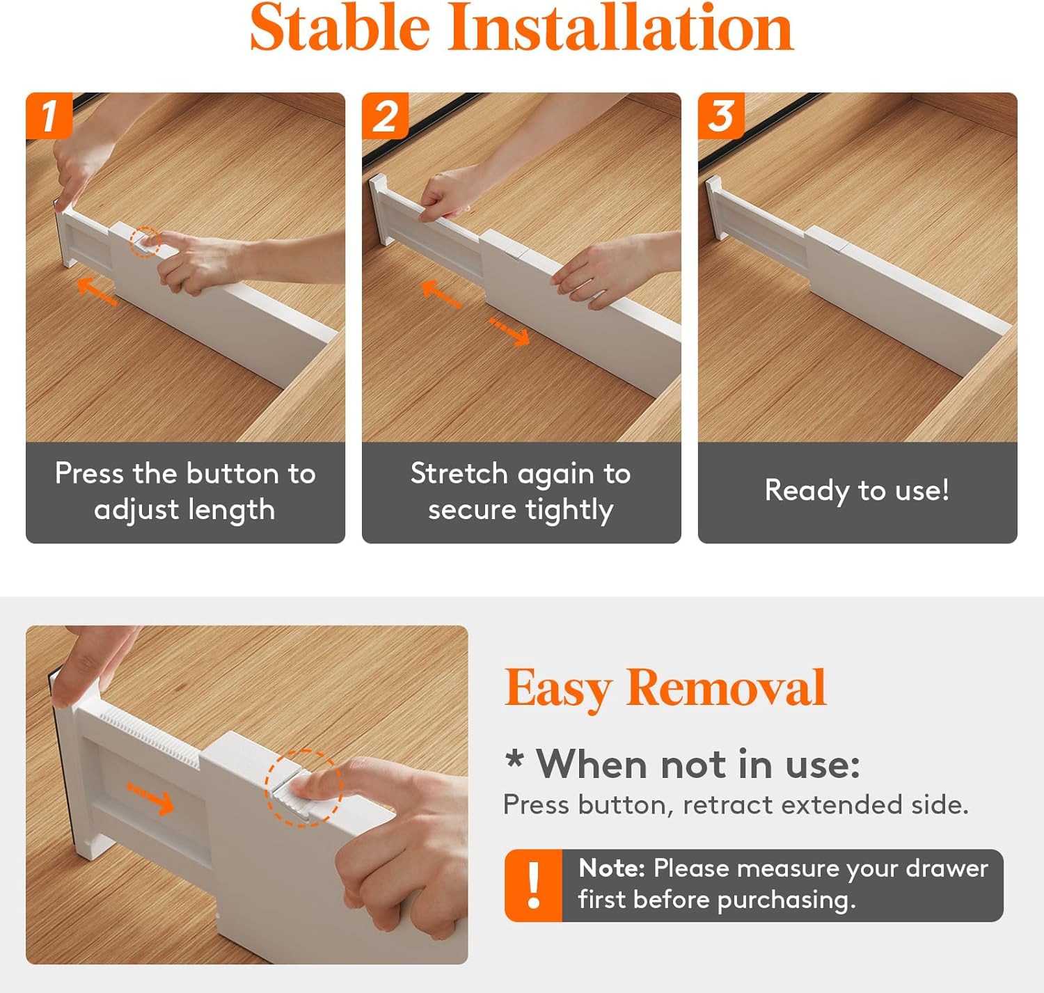 - Expandable & Adaptable: With a compact width of 0.8", a height of 4", and an adjustable length ranging from 13.5" to 22", our drawer dividers effortlessly fit into most drawers and cabinets, providing a perfect solution for organizing your items and maintaining tidy drawers consistently.