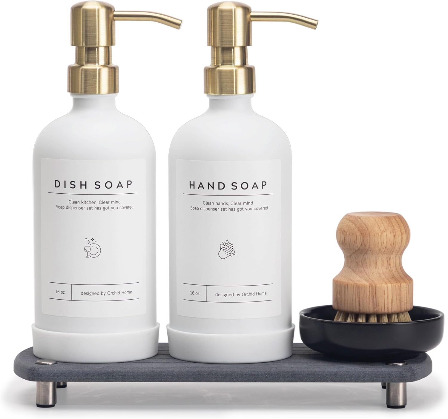 [Luxury] Kitchen Soap Dispenser Set - 16OZ White Glass Bottle, Stainless Steel Pump, Instant Dry Tray, Waterproof Labels, Non-Slip Silicone Pad, and Dish Brush | Upgrade for Your Kitchen and Bathroom