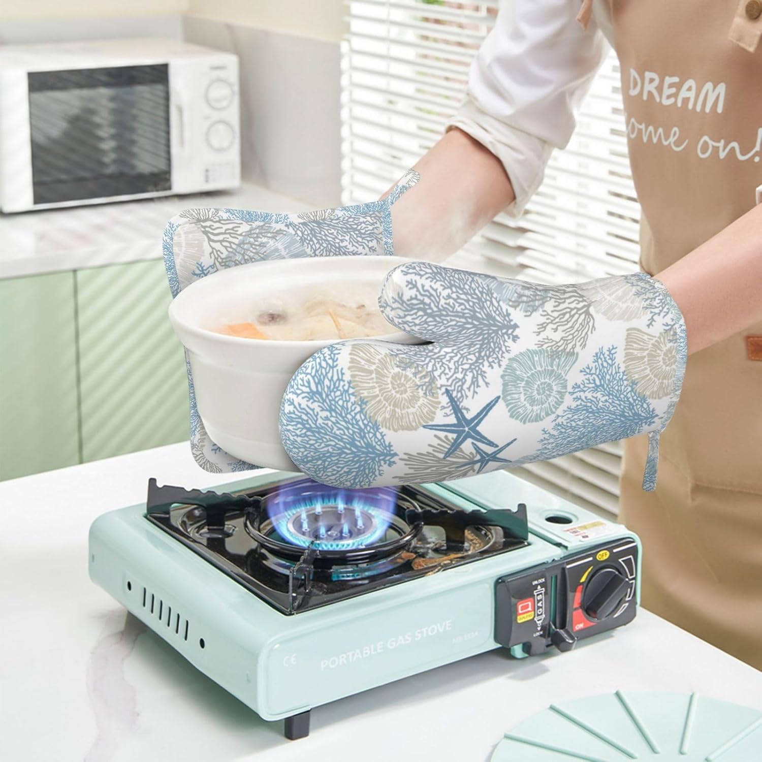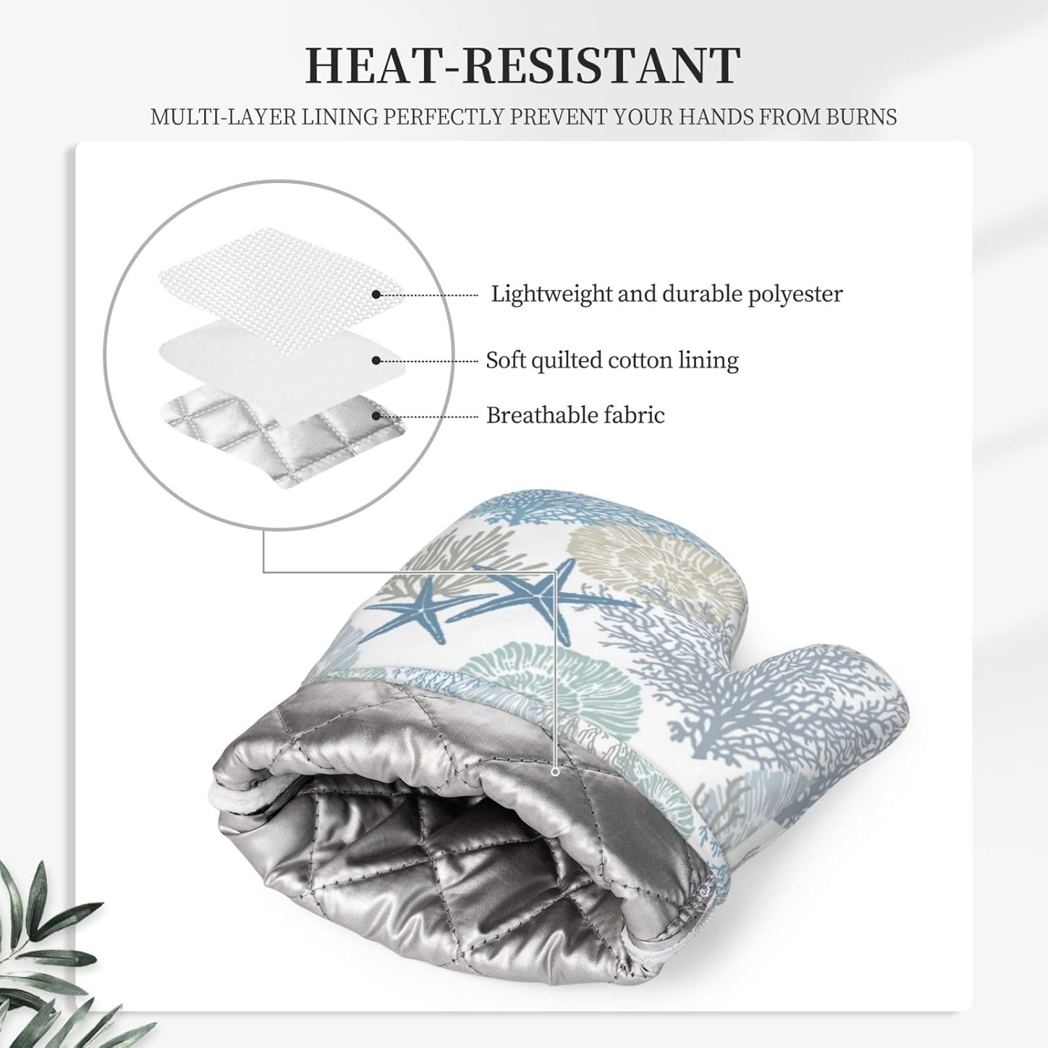 - HEAT RESISTANT: Thicker starfish seashell coral beach oven mitts and potholders, heat resistant up to 392 F/ 200 C. Well protect your hands and wrists from burns or steam scalds, and make your cooking time easy and safe. To keep safe-do not use pot holder or oven mitt over an open flame.