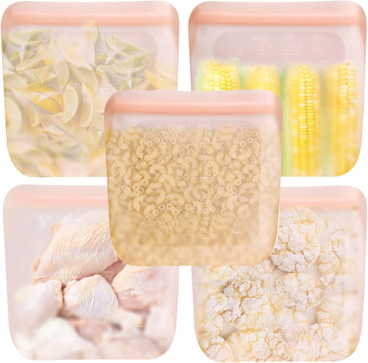 purifyou Set of 5 Reusable Silicone Storage Snack Bags 6oz / 16oz / 32oz / 64oz Self-Seal Food Storage Container for Fruits, Vegetables, Sandwiches, Dishwasher Safe & Leak-free (CloudPink, 32oz)