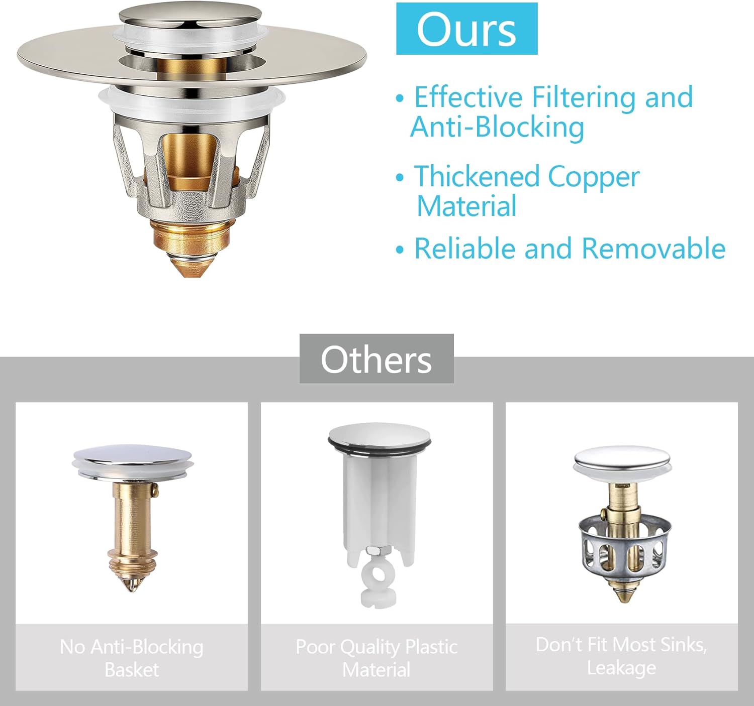 - [ with Hair Catcher ] The drain plug with an anti-blocking basket strainer inside which can collect hairs and prevent the drain from clogging up, achieving effective filtering, unlike regular push button drain. Suitable for bathtub, bathroom and kitchen sink, and so on.