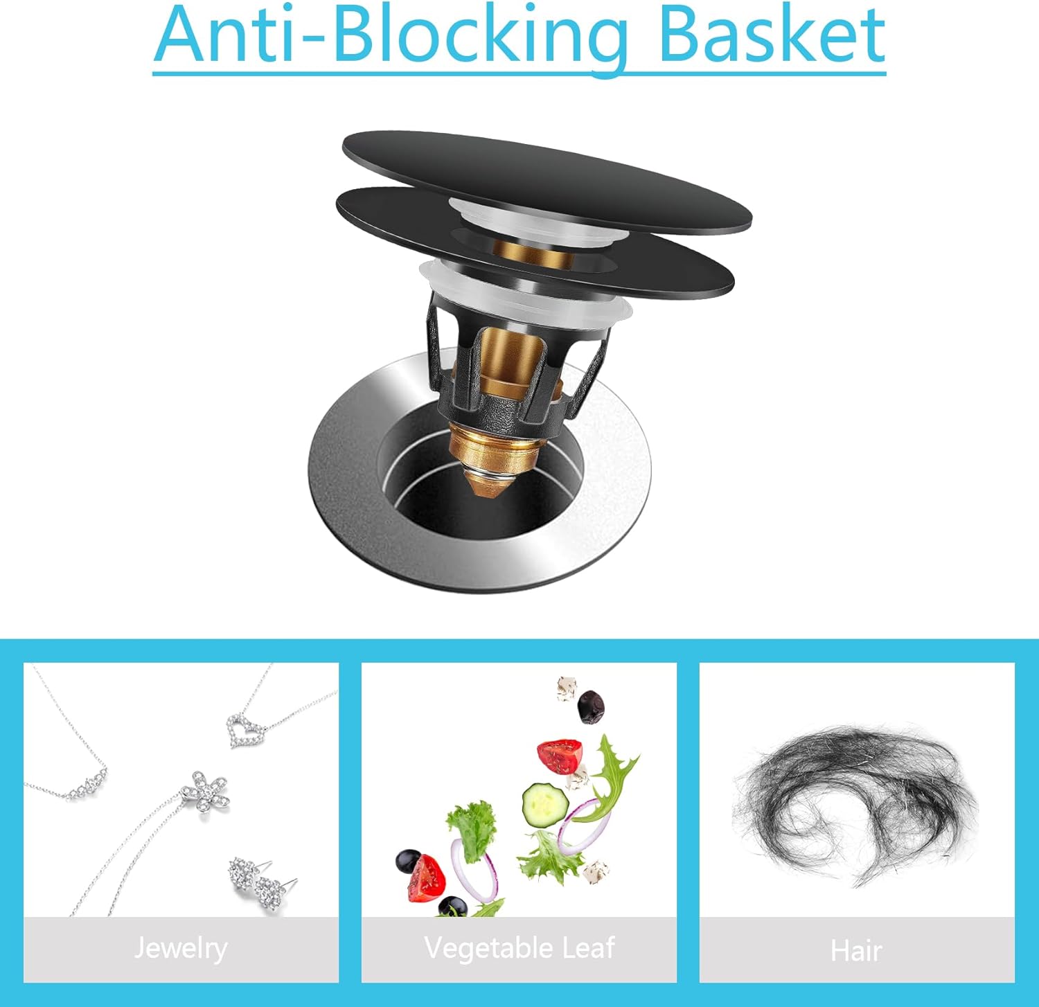 - [ with Hair Catcher ] The drain plug with an anti-blocking basket strainer inside which can collect hairs and prevent the drain from clogging up, achieving effective filtering, unlike regular push button drain. Suitable for bathtub, bathroom and kitchen sink, and so on.