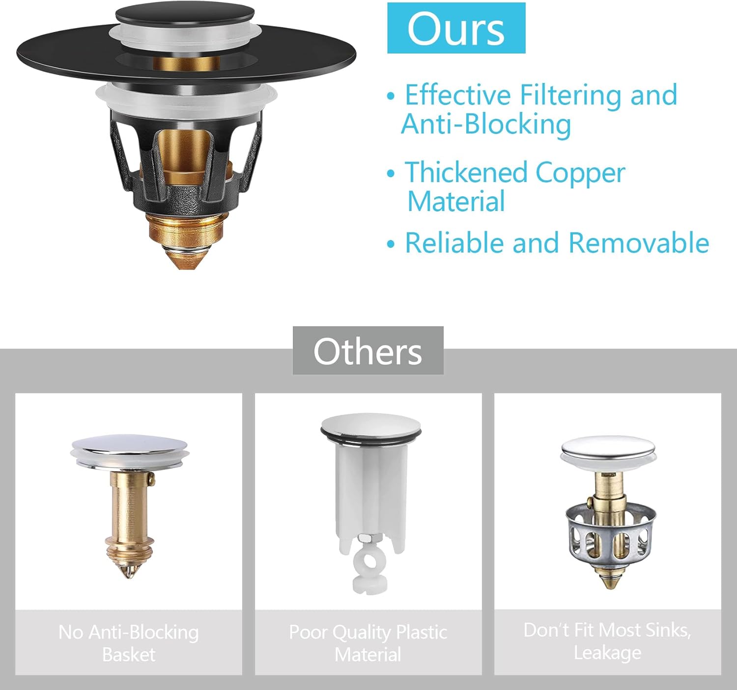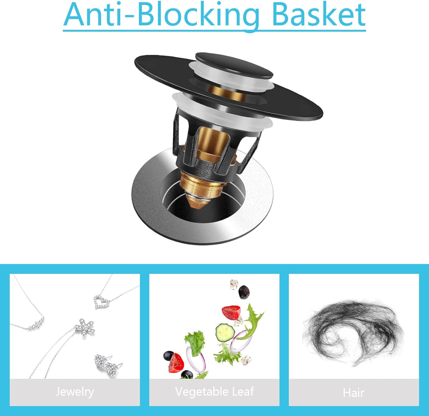 - [ with Hair Catcher ] The drain plug with an anti-blocking basket strainer inside which can collect hairs and prevent the drain from clogging up, achieving effective filtering, unlike regular push button drain. Suitable for bathtub, bathroom and kitchen sink, and so on.