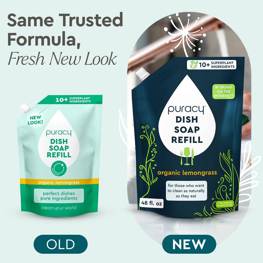 Puracy Natural Dish Soap Refill Bundle- Enzyme-Powered Dishwashing Soap, Organic Dishsoap Liquid Clean Non-Toxic (Organic Lemongrass, 16oz and 48oz Refill)