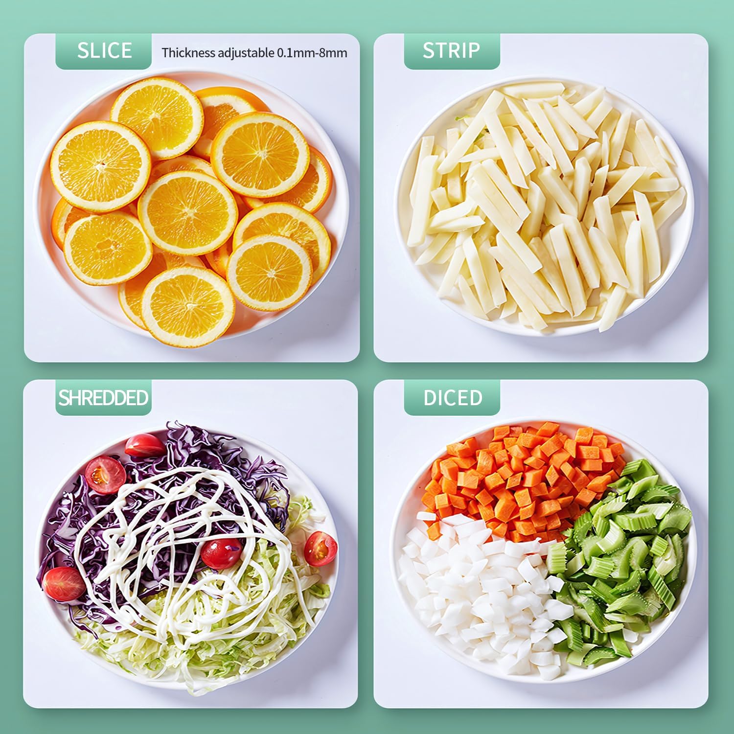 - 6-IN-1 MULTIFUNCTIONAL BLADES FOR EVERY CULINARY NEED Equipped with 6 interchangeable steel blades to handle vegetables, fruits, cheese, and even chocolate. Create restaurant-quality salads, stir-fries, or garnishes in seconds—ideal for home chefs, meal preppers, and party hosting.
