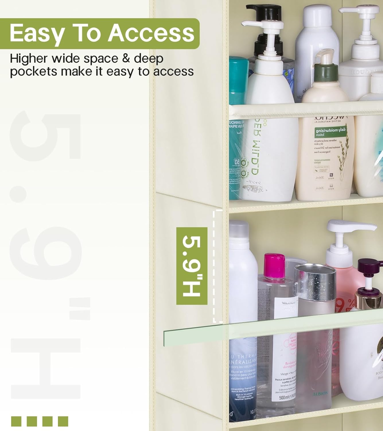 - ăHigher & Deeper Pocketsă: The space between the pockets is 5.9", Large interlayer spacing design allows you can easily store tall bottles without falling out, such as toiletries, shampoos, make ups etc. Dimension of each Pocket:12.2"Wx6.5"Dx10.6"H;
