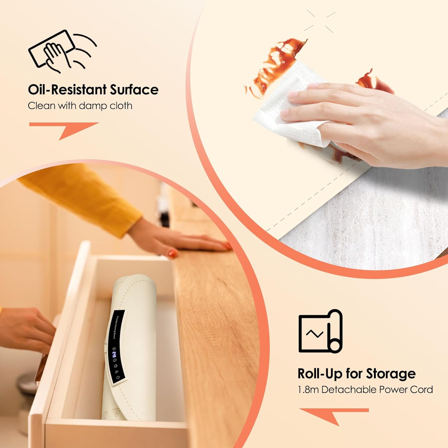 - [Durable & Easy to Maintain] Crafted from premium flexible silicone, our silicone food warmer mat is built to last. It's splash-proof, stain-resistant, and oil-resistant, and can be easily rolled up for storage. Cleaning is a breeze with just a quick wipe
