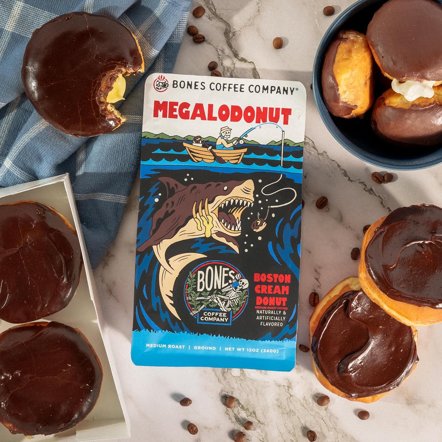 Bones Coffee Company Megalodonut, Boston Cream Donut Flavored Coffee, Medium Roast Low Acid Arabica Beans Compatible with Auto drip and French Press Coffee Maker, 12 Oz Ground