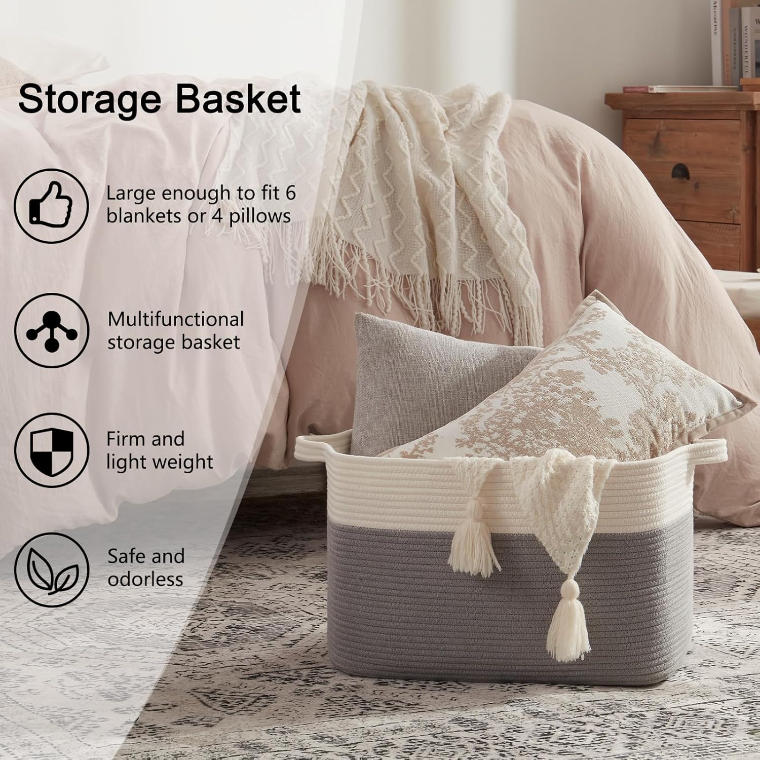 - 100% Cotton Rope Basket for Blankets:OIAHOMY woven basket is made of 100% natural cotton, chemical and odor free, there are no sharp or hard edges to scratch floos, and safe for kids and pets. It is more firm than plastic basket