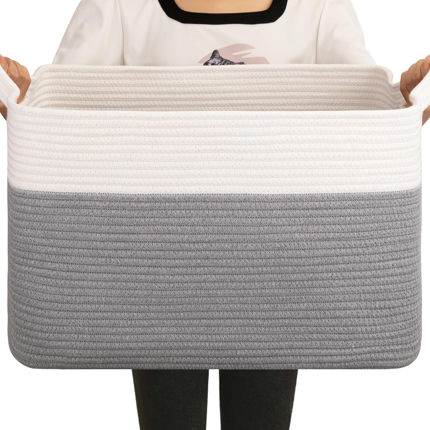 OIAHOMY 65L Blanket Basket, Cotton Rope Woven Blanket storage for Living Room, Rectangle Woven Baskets for Storage, 20''×16''×12'', Grey and White