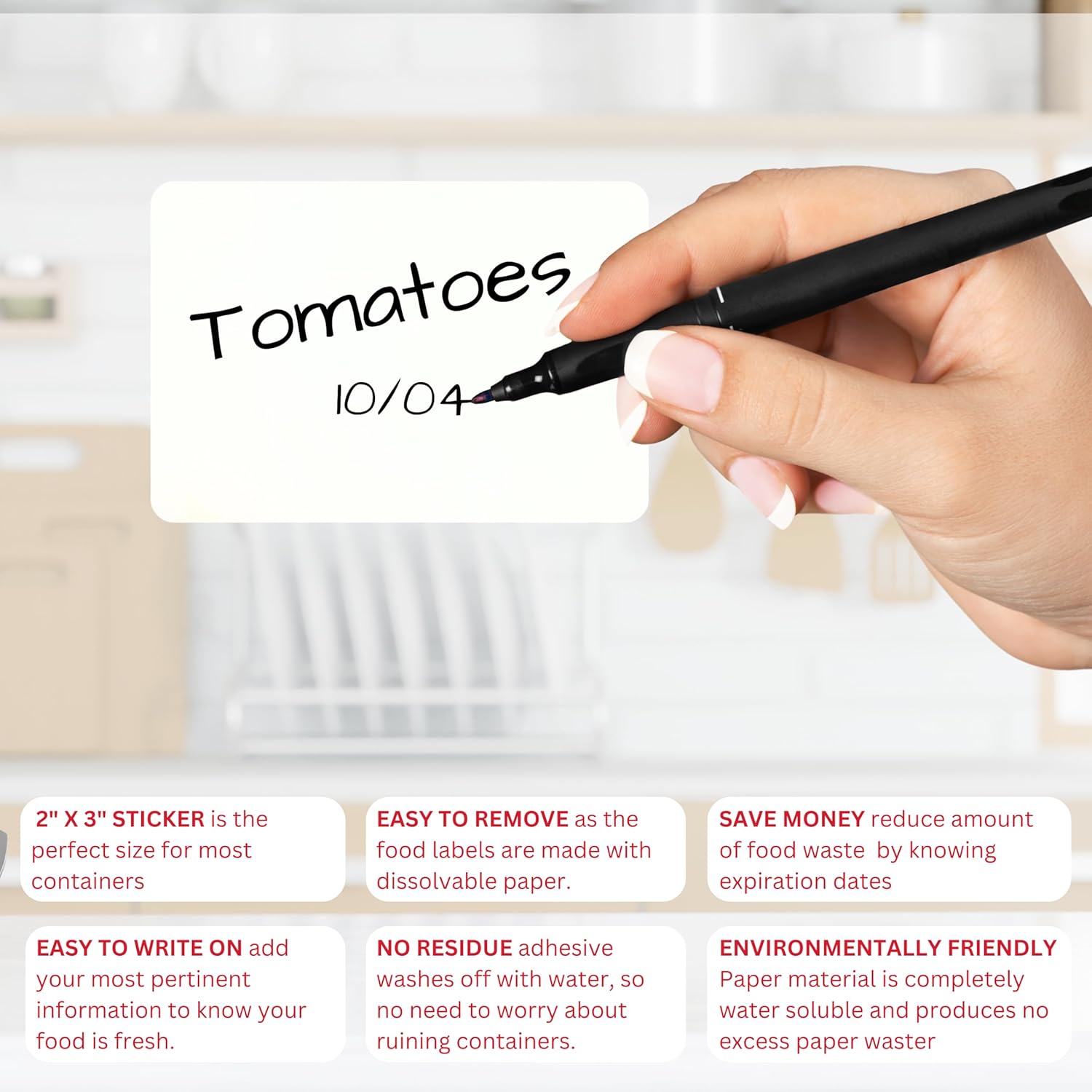 - Fully Dissolvable: These labels for food containers dissolve completely in water, whether in the dishwasher or under running water, leaving no sticky residue behind. They are perfect for labeling food containers or freezer storage and can be effortlessly removed after use.