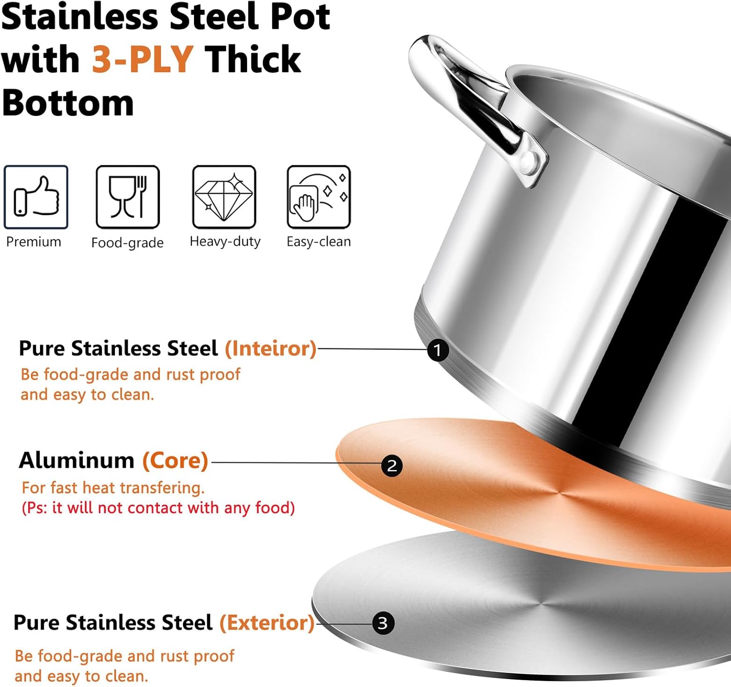 - 【Healthy Material & Tri-ply Bottom】P&P CHEF cooking pot is made of premium stainless steel, rust and corrosion proof, No fear of toxic substance leaching into your food even at any temperature, Tri-ply bottom which consists of stainless steel interior and exterior (ensures food-grade cooking, and makes it could works with many stoves), aluminum core (for a fast and even heating), Thickened bottom also better to store heat, Makes body and bottom of pot heat evenly for better taste