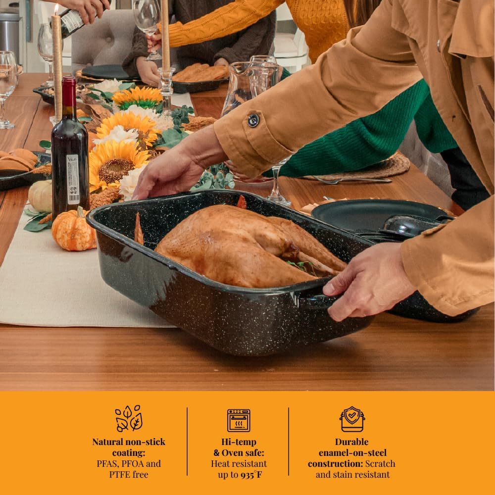 Granite Ware 21 in Oven Rectangular Roaster with lid and V Rack (Speckled Black) - Accommodates up to 25 lb poultry or roast.