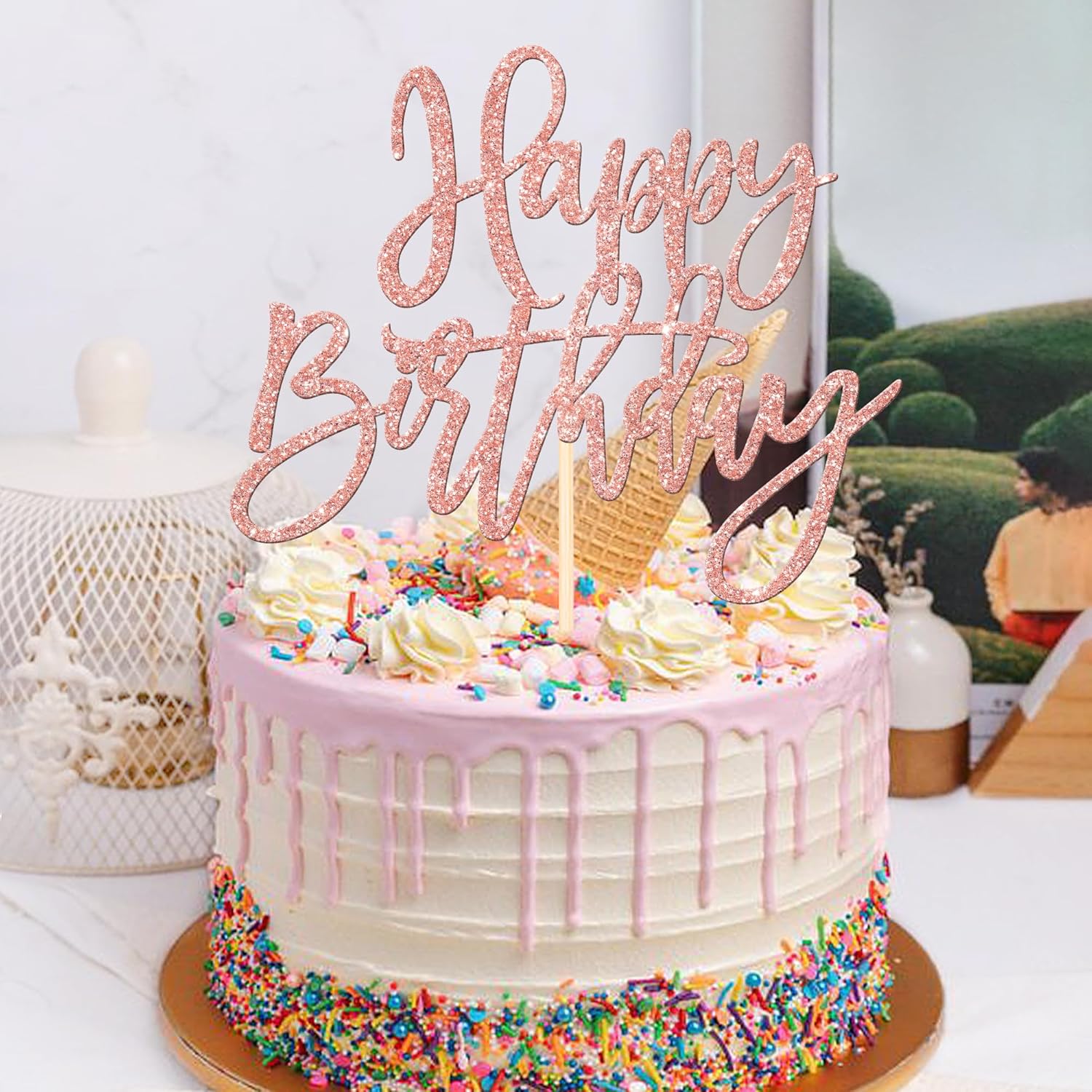 ZHUOWEISM 1 PCS Happy Birthday Cake Topper Glitter Happy Birthday Cake Pick for Celebrating Happy Birthday Anniversary Theme Party Cake Decorations Supplies Rose Gold