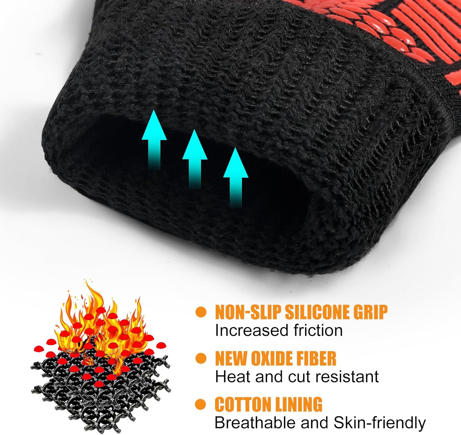 - 【Extreme Heat Resistance】Our barbecue gloves & oven mitts, are designed to withstand temperatures up to 1472°F(Test max temperature tolerance), providing perfect protection for your hands from high temperatures whether you're grilling, baking, or cooking.