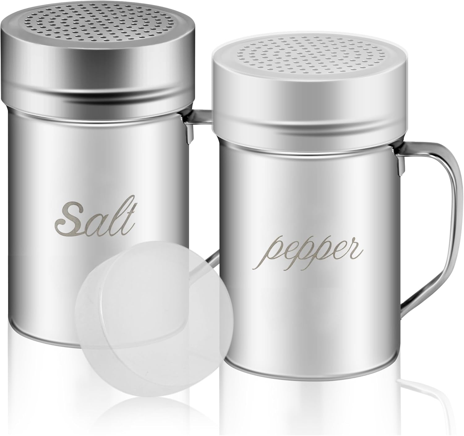 Stainless Steel Salt and Pepper Shakers Set, 14 OZ Seasoning Spice Shaker with Lid and Handle 127 Holes, Metal Dredge Shaker for Powder Sugar Cooking Kitchen Baking (2 Pieces)
