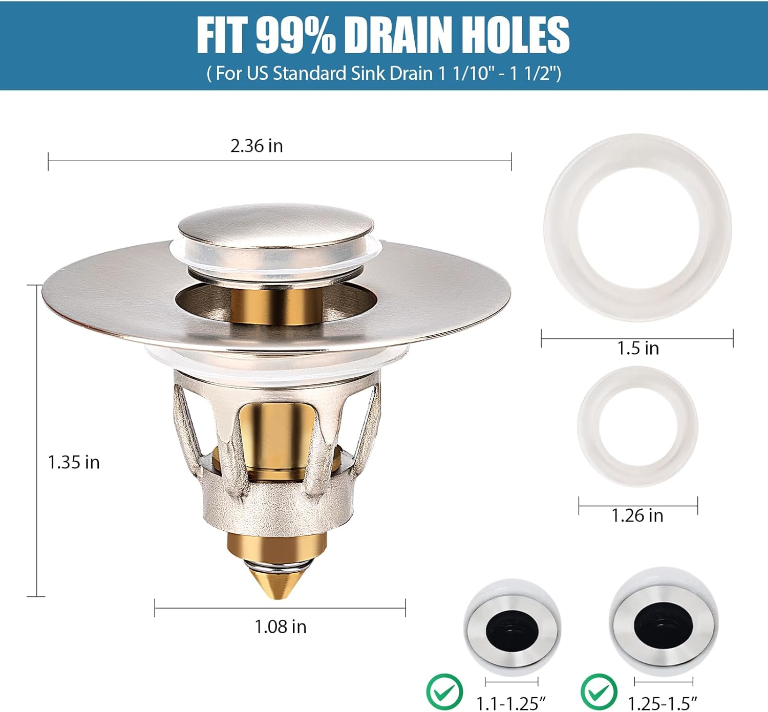 - Compatibility: The bathroom sink stopper fits for US standard sink drain 1 1/10 inches - 1 1/2 inches in diameter and over 1.53 inches deep. It can be used for wash basin, sink drain. Please be sure to measure the size of the sink drain before purchase