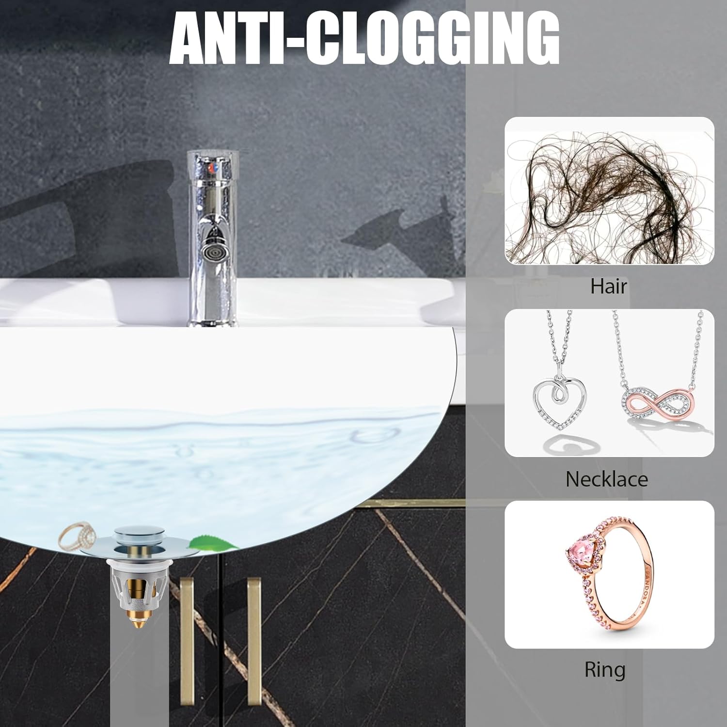 - 2 In 1 Design: The bathroom sink drain strainer has built-in spring that switches freely between pop-up and sealed states with touch. Best of all, it has an anti-clogging basket filter inside that prevents clogged drains such as hair, bracelets