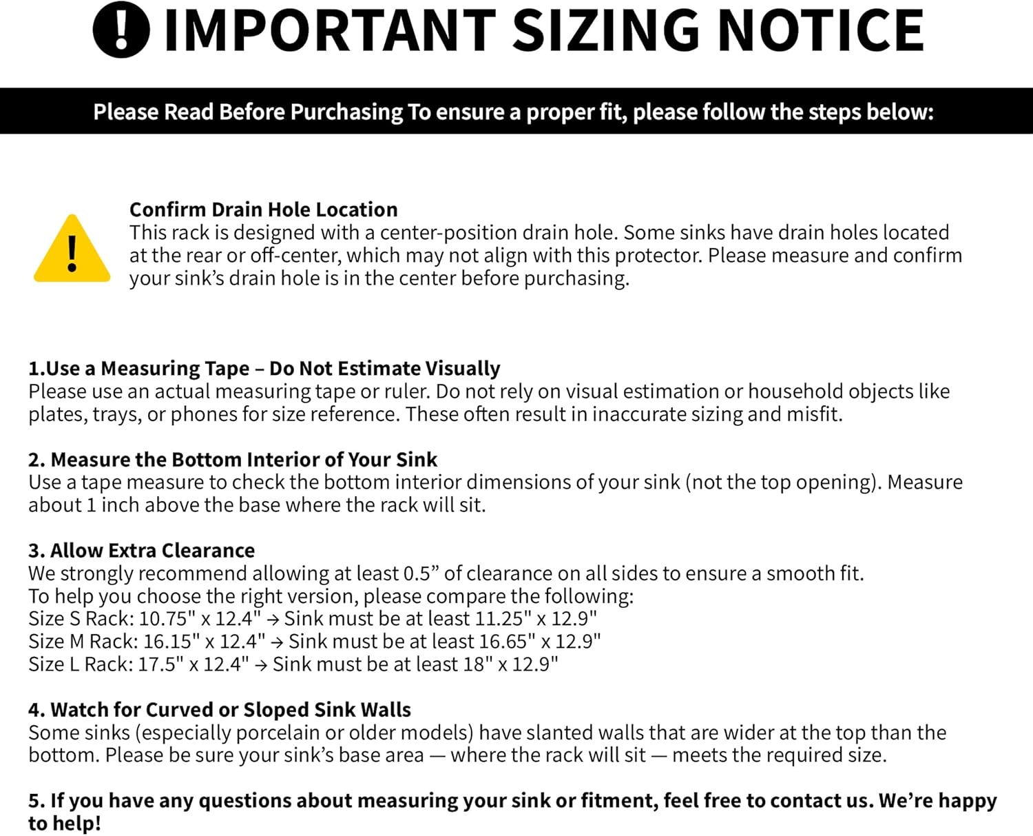 - ⚠️3. Allow Extra Clearance. This rack’s outer dimensions are 10.75” (L) x 12.4” (W). We strongly recommend allowing at least 0.5” of clearance on all sides to ensure a smooth fit. To help you choose the right version, please compare the following: Size S Rack: 10.75" x 12.4" → Sink must be at least 11.25" x 12.9"