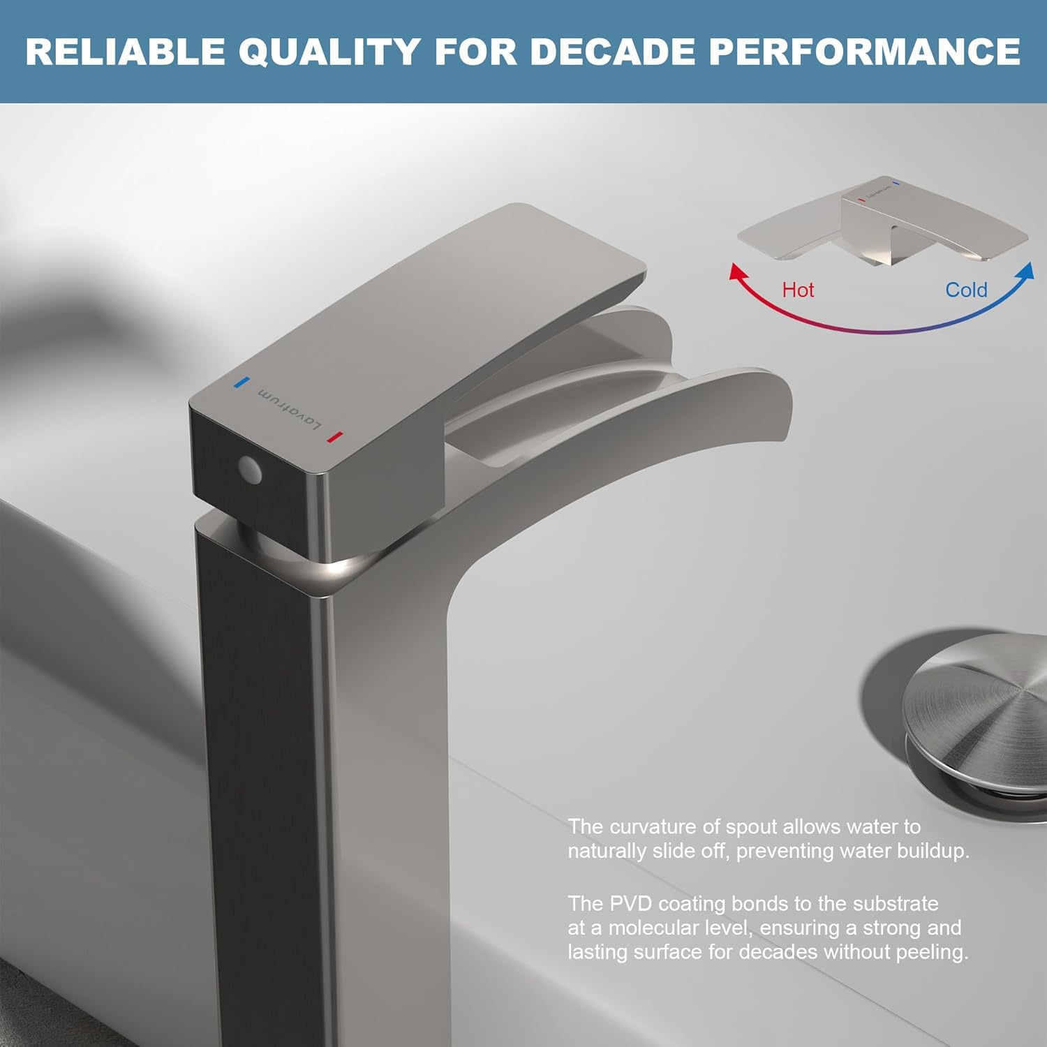 - ăWide Waterfall Spout for a Unique Water Flowă The generously wide waterfall spout delivers a natural, eye-catching water flow that adds a touch of elegance and luxury to your daily routine, enhancing your water use experience with its visually appealing design.