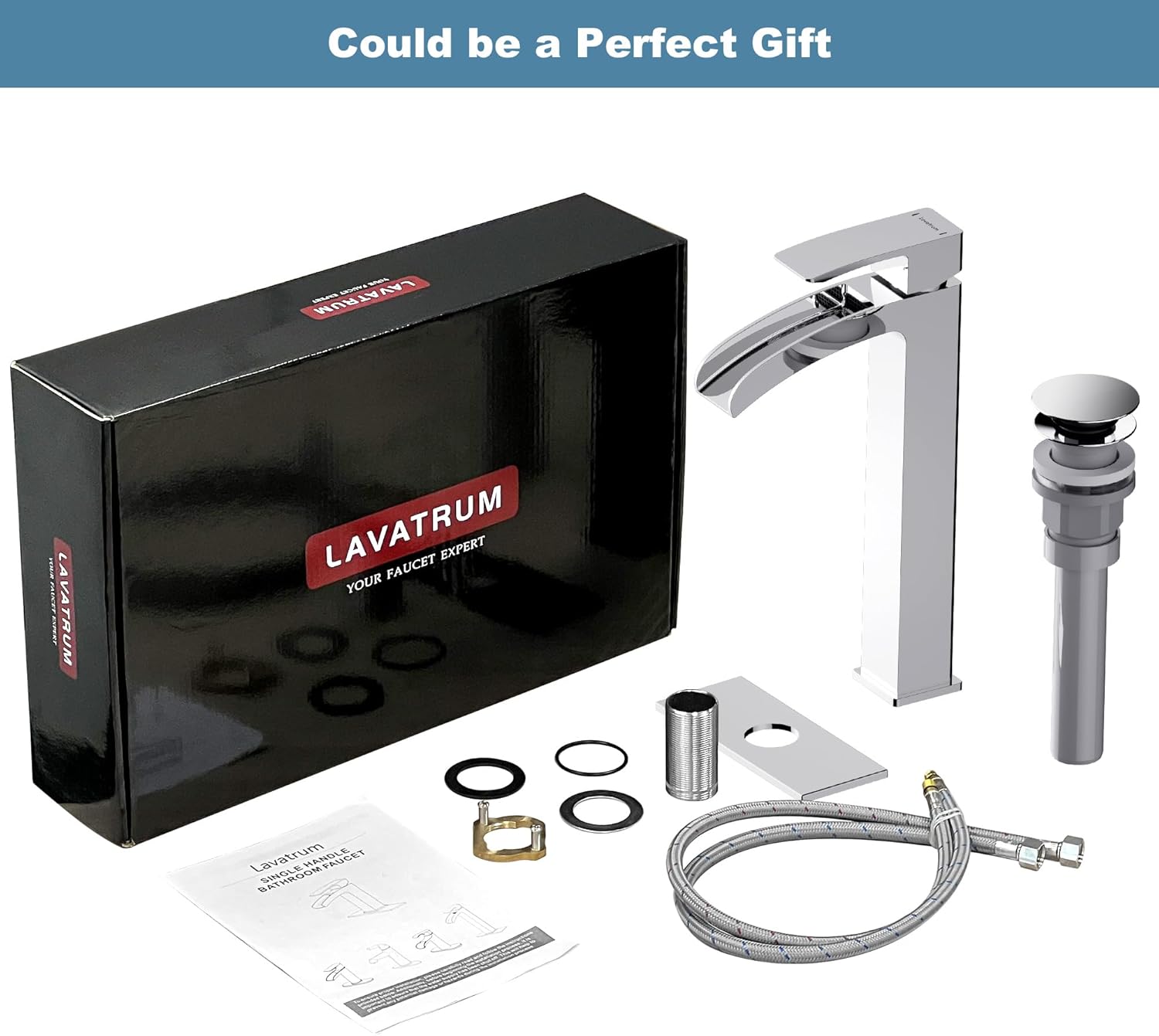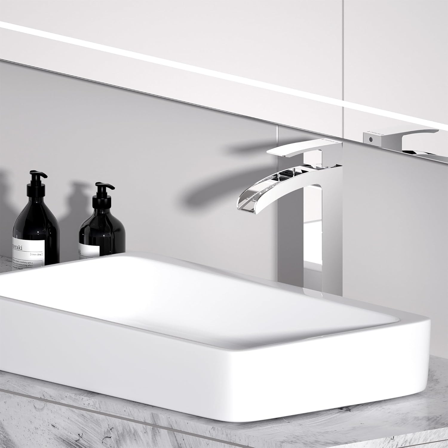 Bathroom Faucet Tall Vessel Sink Waterfall Faucet Deck Mount Single Handle Lavatory with Water Supply Line(Polished Chrome)