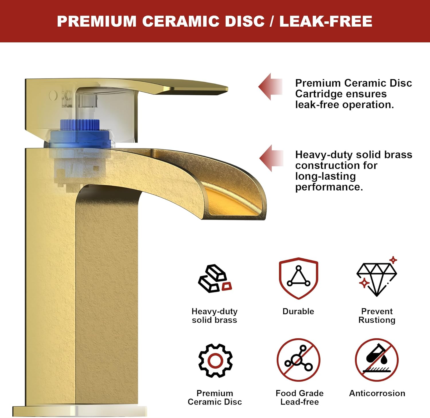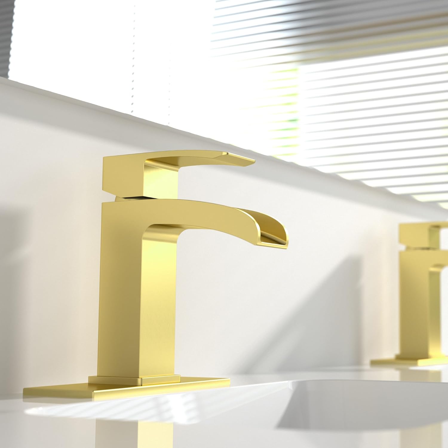 Brushed Gold Bathroom Faucet Waterfall Vanity Faucet for Brass 1 Hole Sink Single Handle Modern Mixer Tap with Pop-up Drain Stopper for Lavatory Farmhouse Rv
