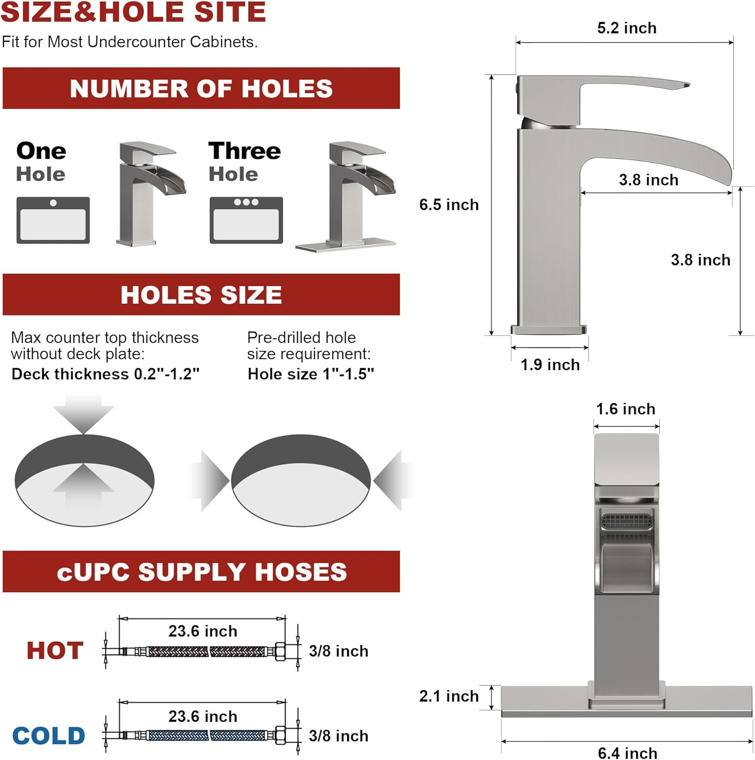 - Simple Installation: All-metal fitting assembly ensures long-lasting performance without sliding, while pre-installed water supply lines integrated into the faucet eliminate one potential leak point. Flexible supply lines are included for faster and easier installation, designed specifically for 1 or 3 holes installation. (three-hole escutcheon included)