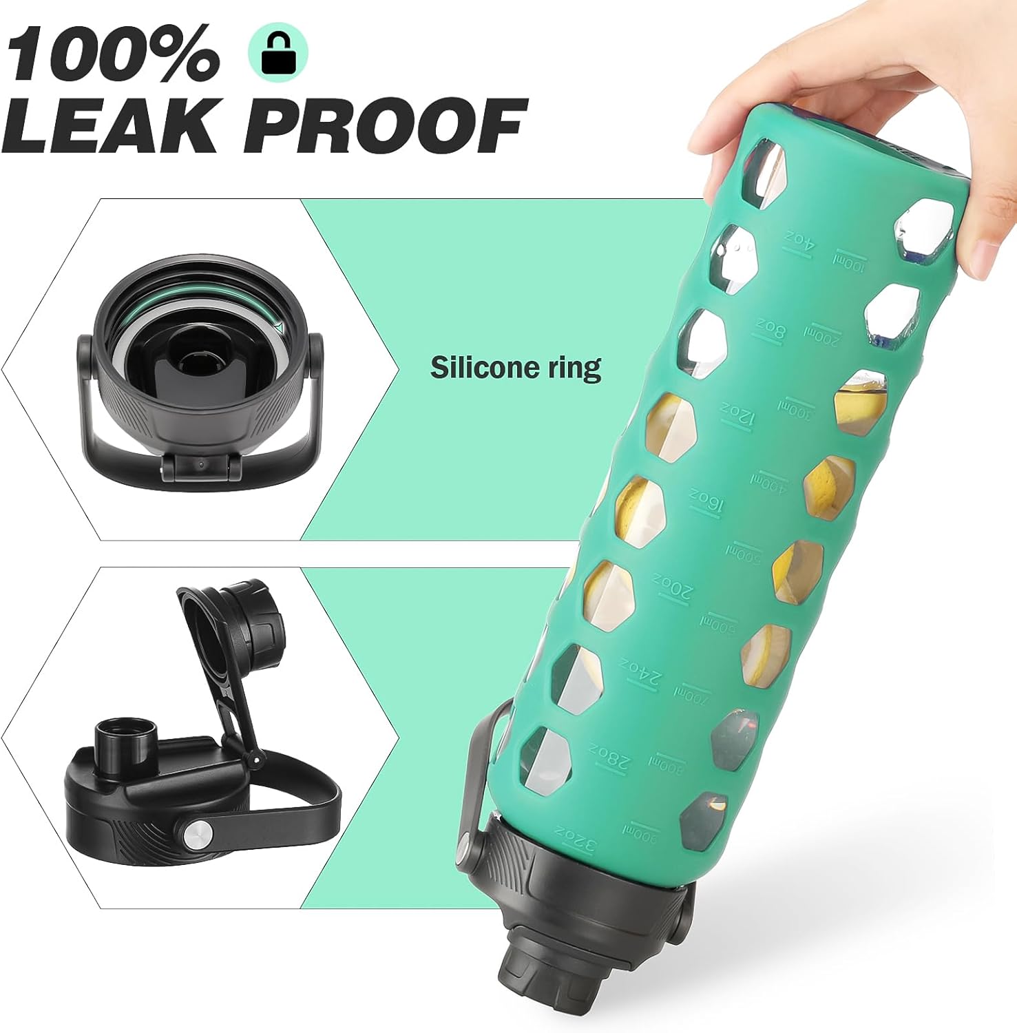 MUKOKO Glass Water Bottles, 32oz Glass Tumbler with Straw, Drinking Bottles with 2 Lids-Handle Spout Lid&Bamboo Straw Lid, Motivational Water Bottle with Time Marker and Silicone Sleeve, 1 Pack-Green