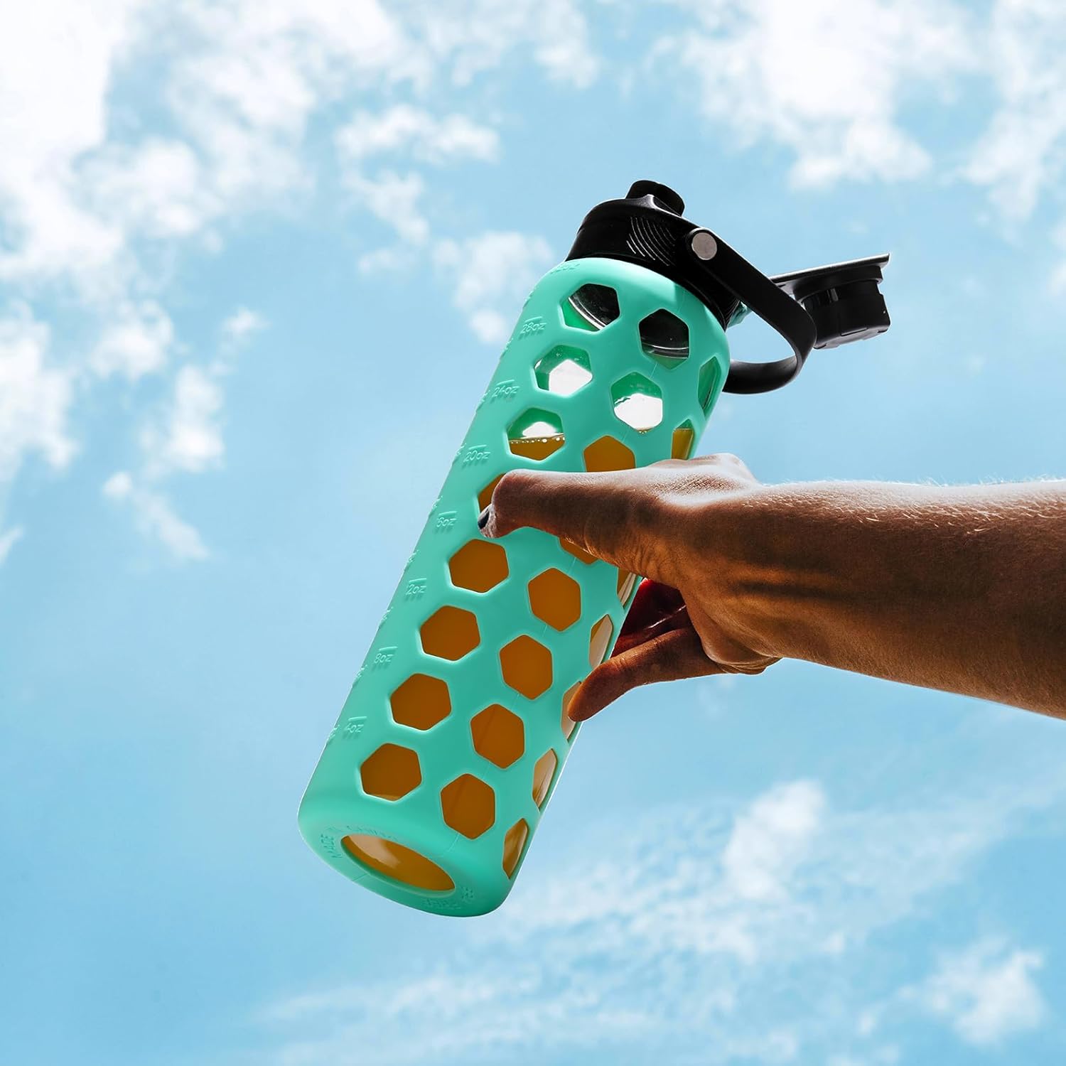 - THE PERFECT DESIGN:Reusable water tumblers are made of more harder and sturdy borosilicate glass and wrapped in a silicone sleeve for a good grip.Especially like that the bamboo lid has a silicone bottom that doesn't contact the liquid inside.