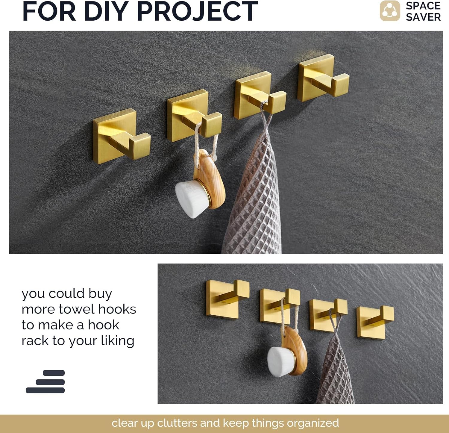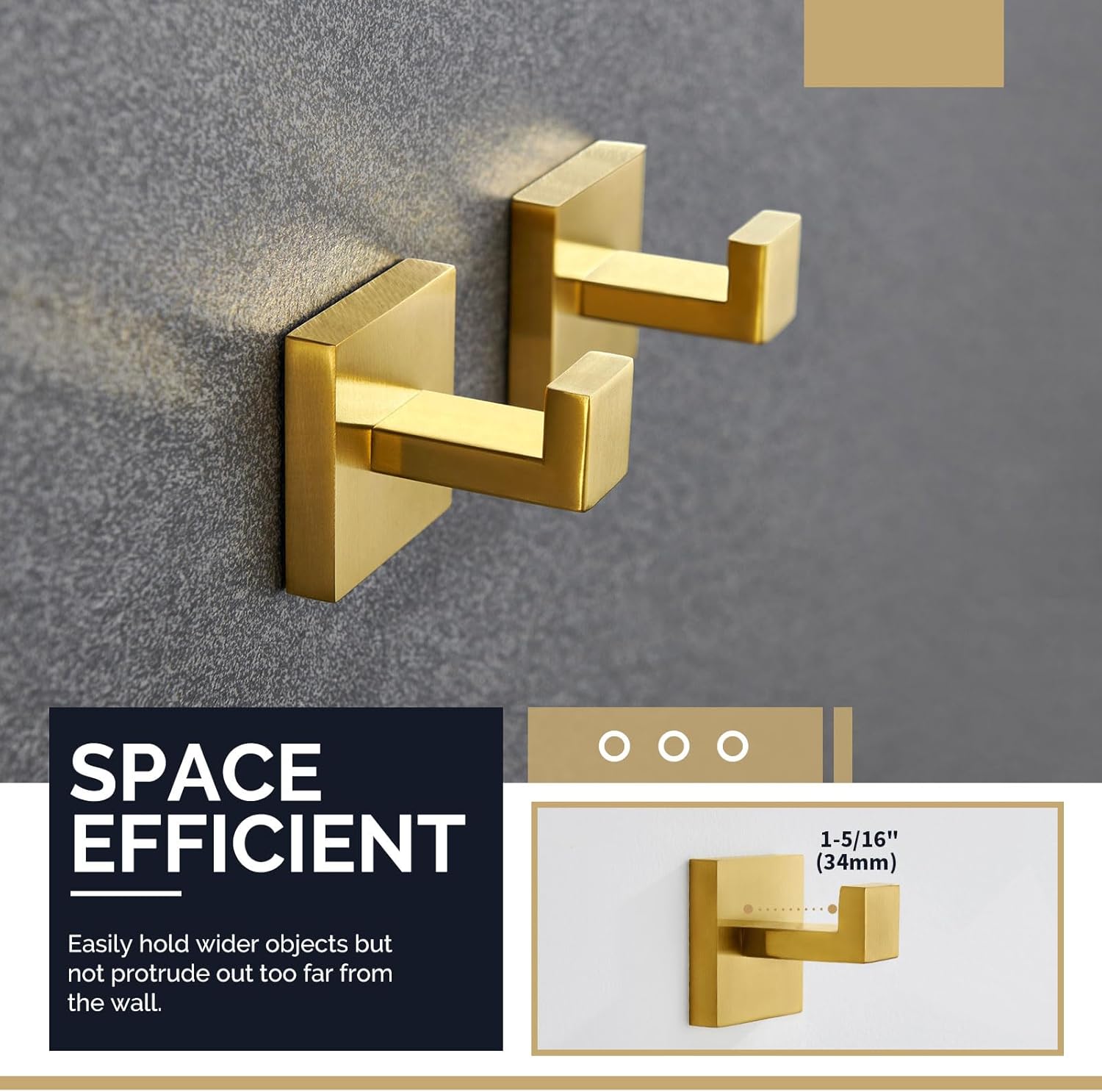 Angle Simple Towel Hook Brushed Gold 2 Pack, 304 Stainless Steel Square Robe Hook for Bathroom